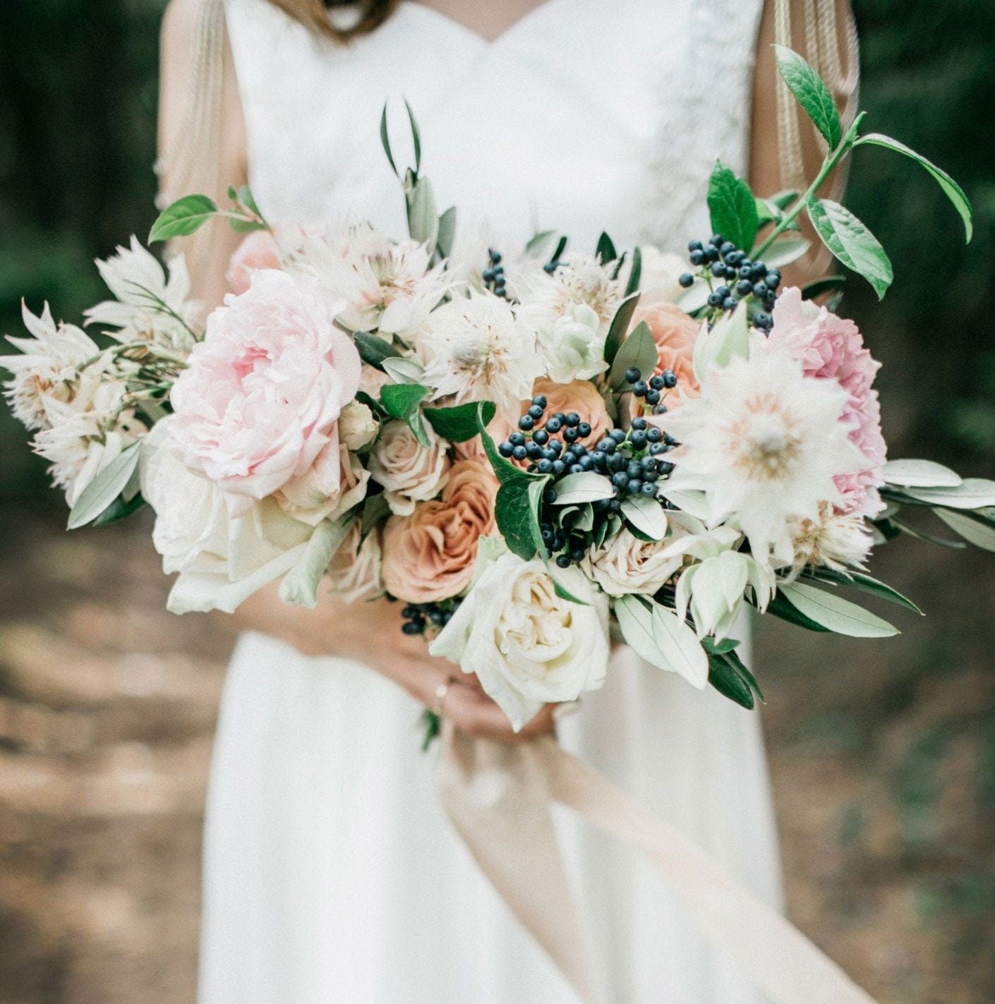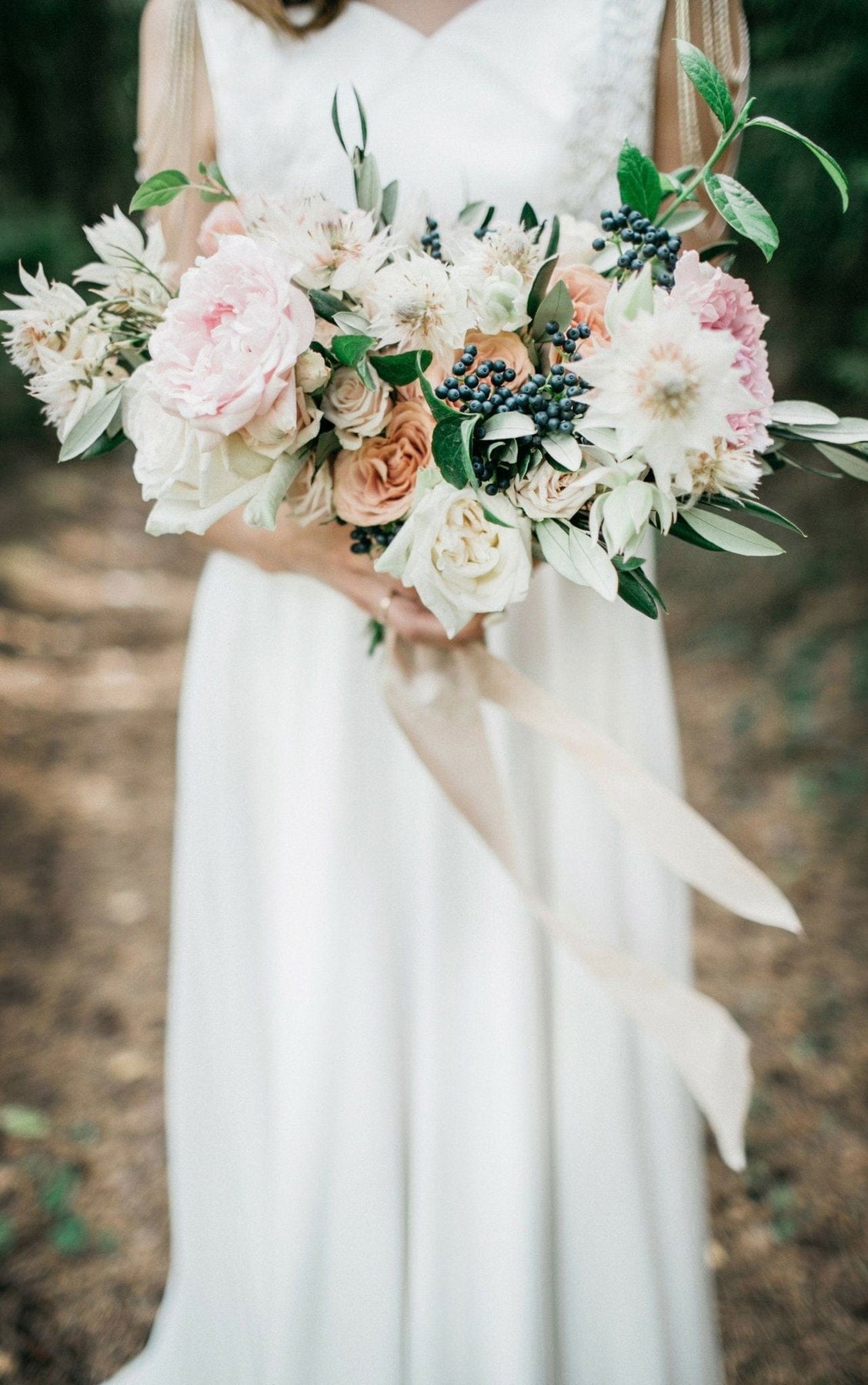Dazzle everyone with enchanting selection of roses, spray roses, peonies, berries, and seeded eucalyptus. Every bride should be the centre of attention on her special day and this stunning bouquet does just that. Bouquets are hand-tied in white satin ribbon.