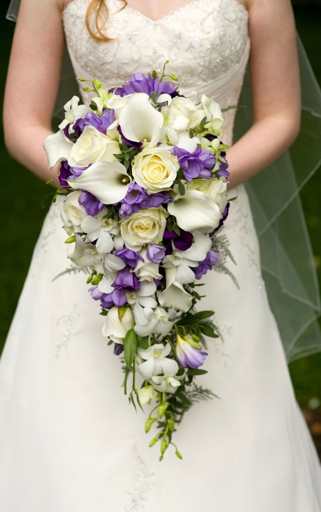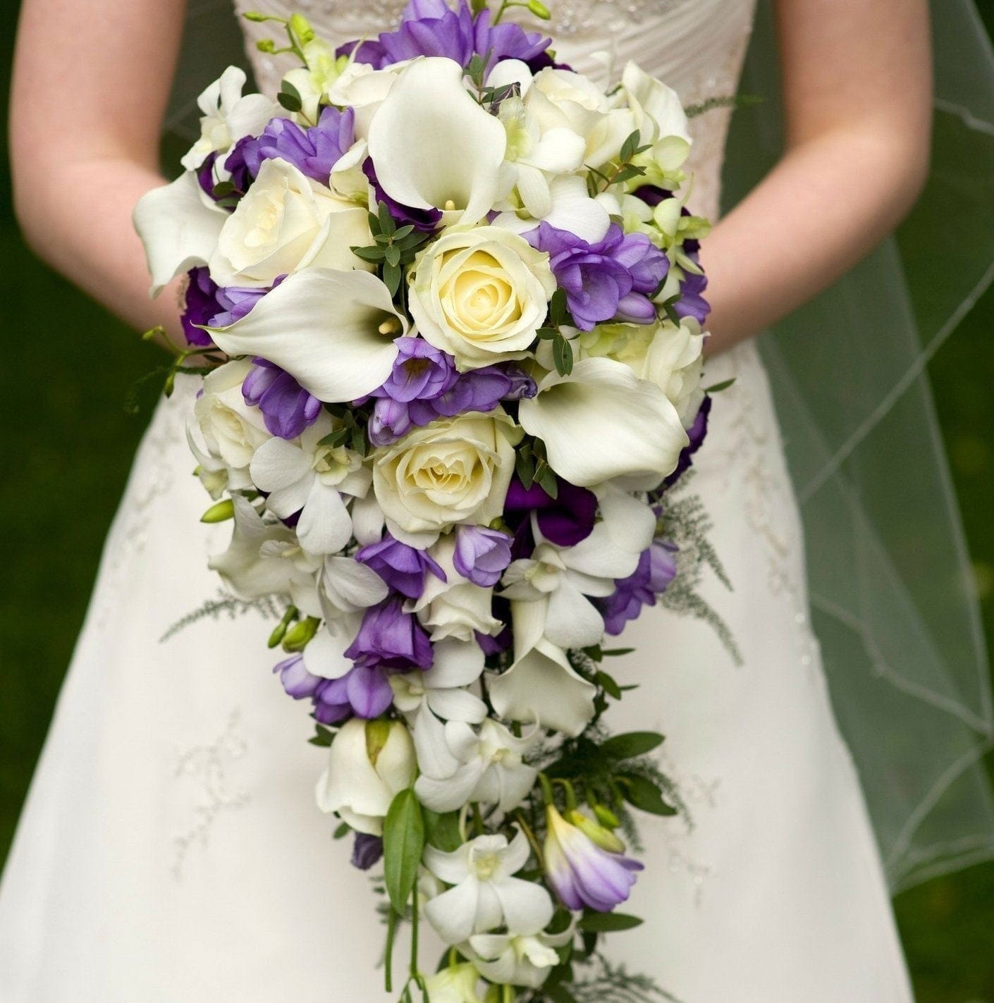 No one will be able to take their eyes off of your divine presence with this lovely selection of roses, calla lilies, freesias, dendrobium orchids, and asparagus plumosas.  This heavenly design radiates beauty, grace, and regality making it perfect for any bride on her special day. Bouquets are hand-tied in white satin ribbon.