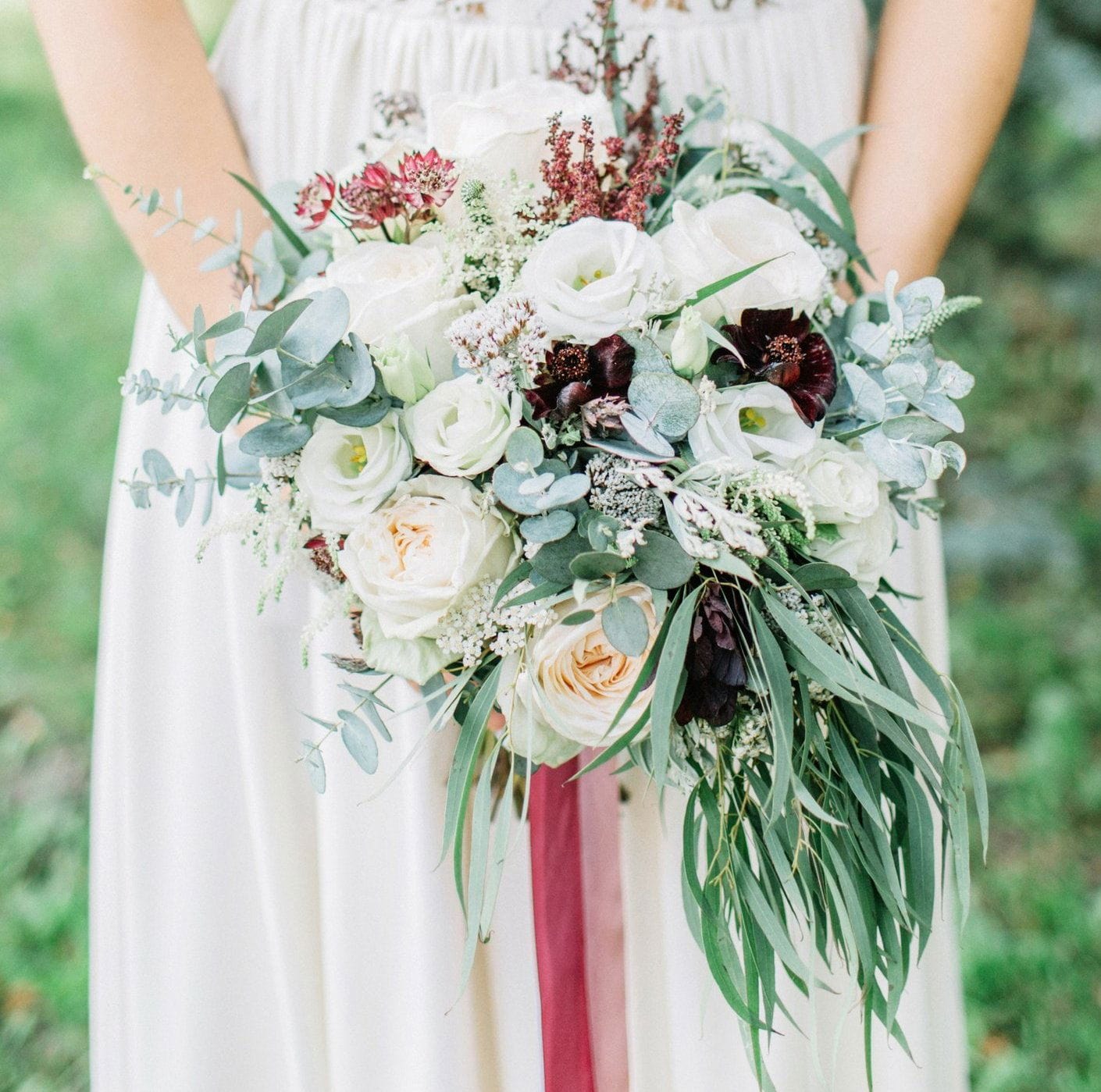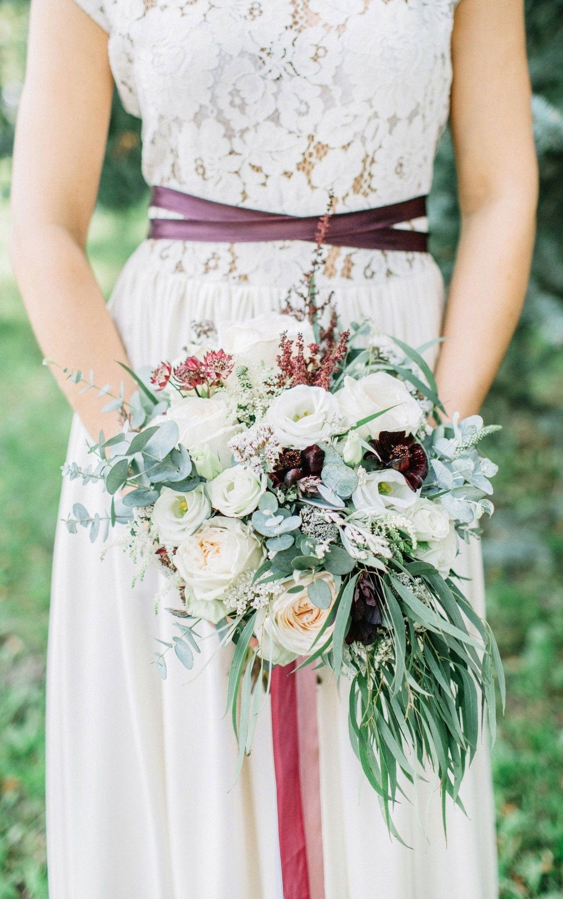 Turn heads and hearts with this resplendent selection of roses, lisianthus, heathers, queen annes laces, and baby eucalyptuses. This design is simple, yet elegantly expresses the chicness of the bride on her special day. Bouquets are hand-tied in white satin ribbon.