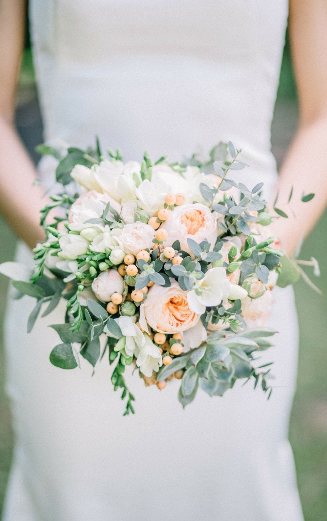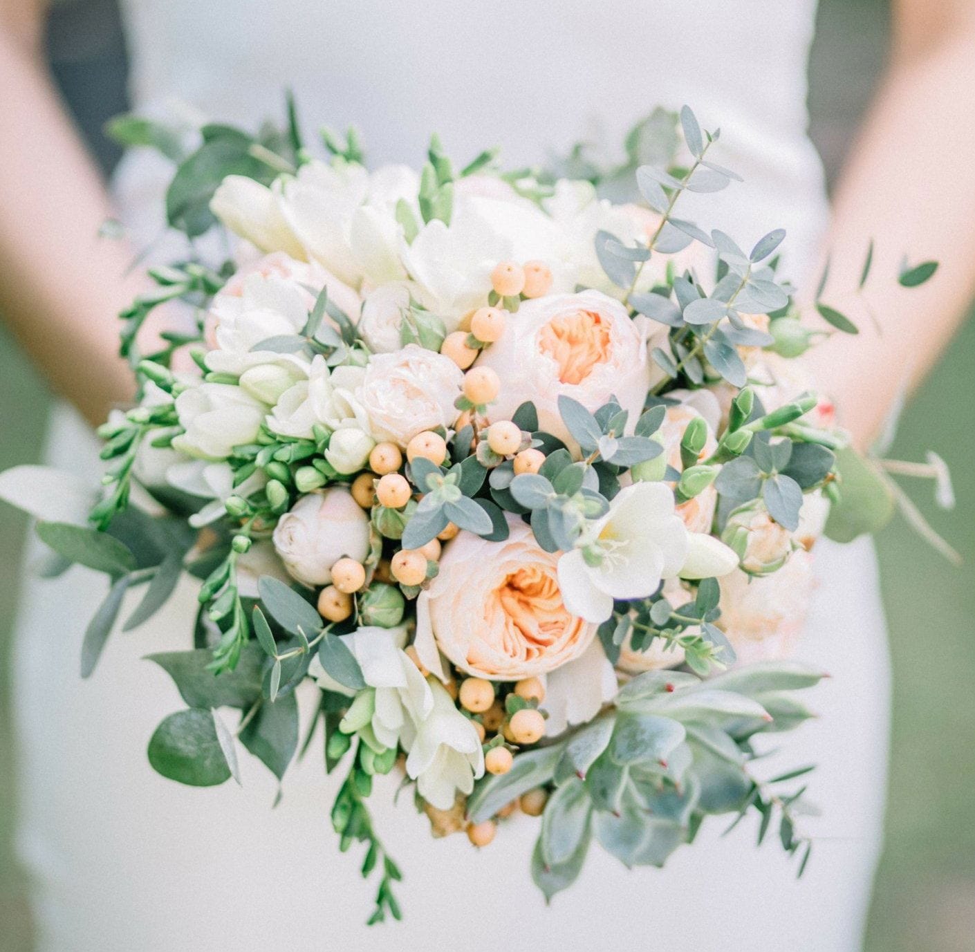 Love and passion are revered through this magnificent selection of peonies, garden roses, hypericums, succulents, and seeded eucalyptuses. A combination of radiant flowers are sure to reflect the reverence of beauty on your special day. Bouquets are hand-tied in white satin ribbon.