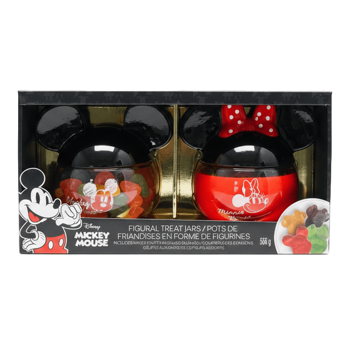 Bring a little Disney magic home with this adorable pair of Mickey & Minnie Mouse figural treat jars! Perfect for gifting, snacking, or decorating, each collectible jar is shaped like the iconic characters we all know and love. Inside, you’ll find a delicious assortment of mixed fruit-flavoured gummies in fun Mickey-shaped pieces.