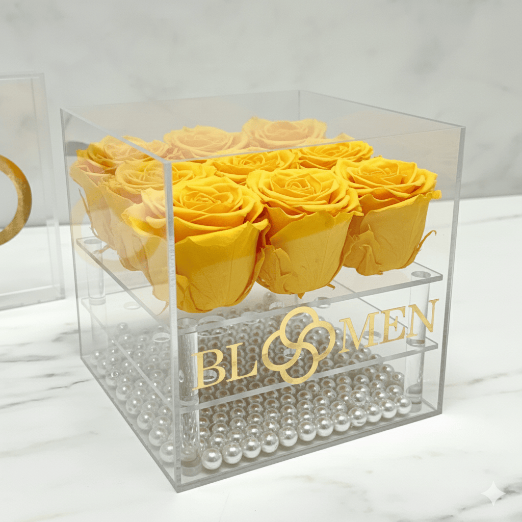 Real roses picked at their most beautiful then preserved to maintain their natural shape , colour and brightness, Bloomen's Everlasting Roses last up to one year.  Beautiful roses in a clear case made this modern arrangement a great way to showcase your love.