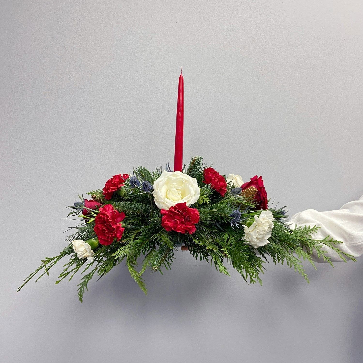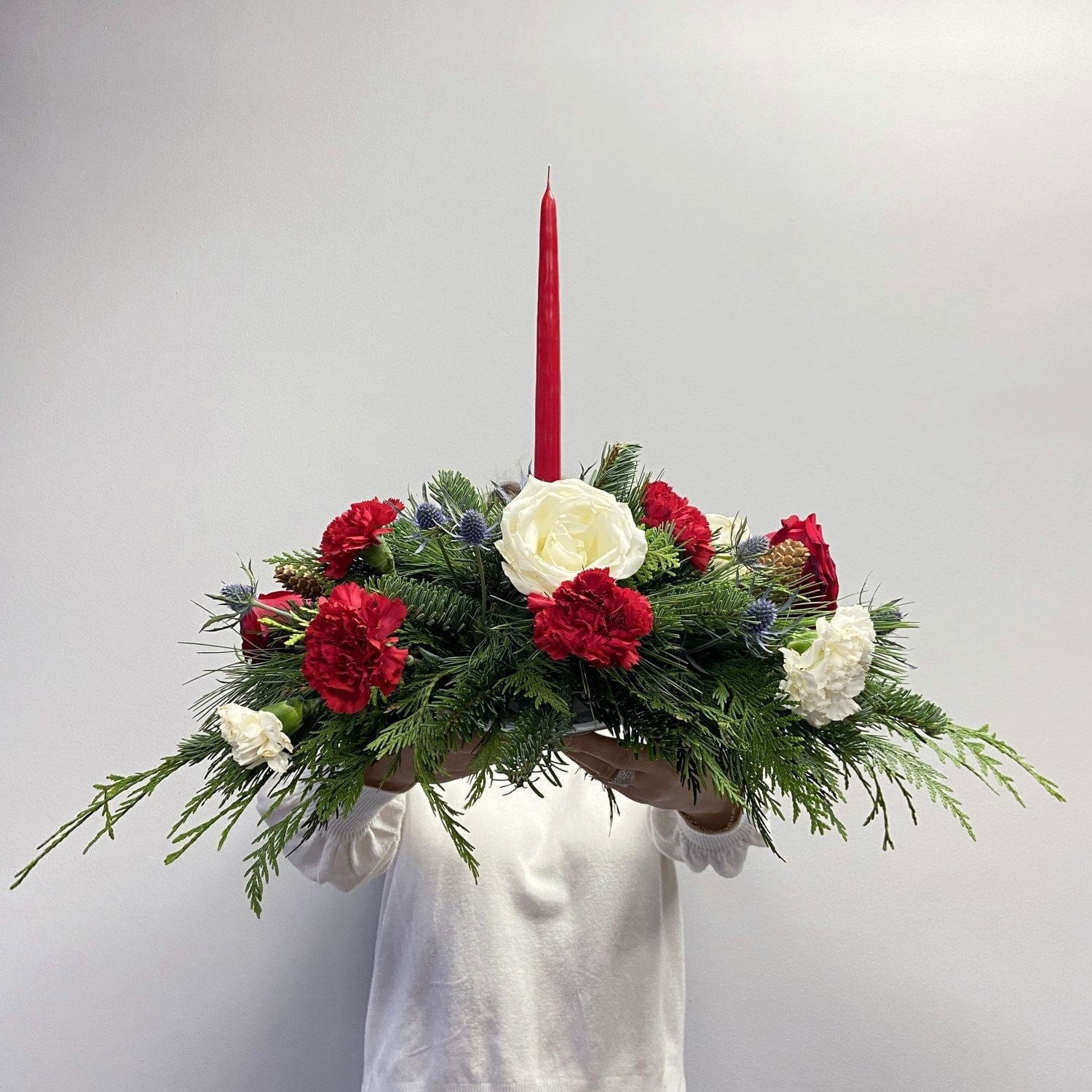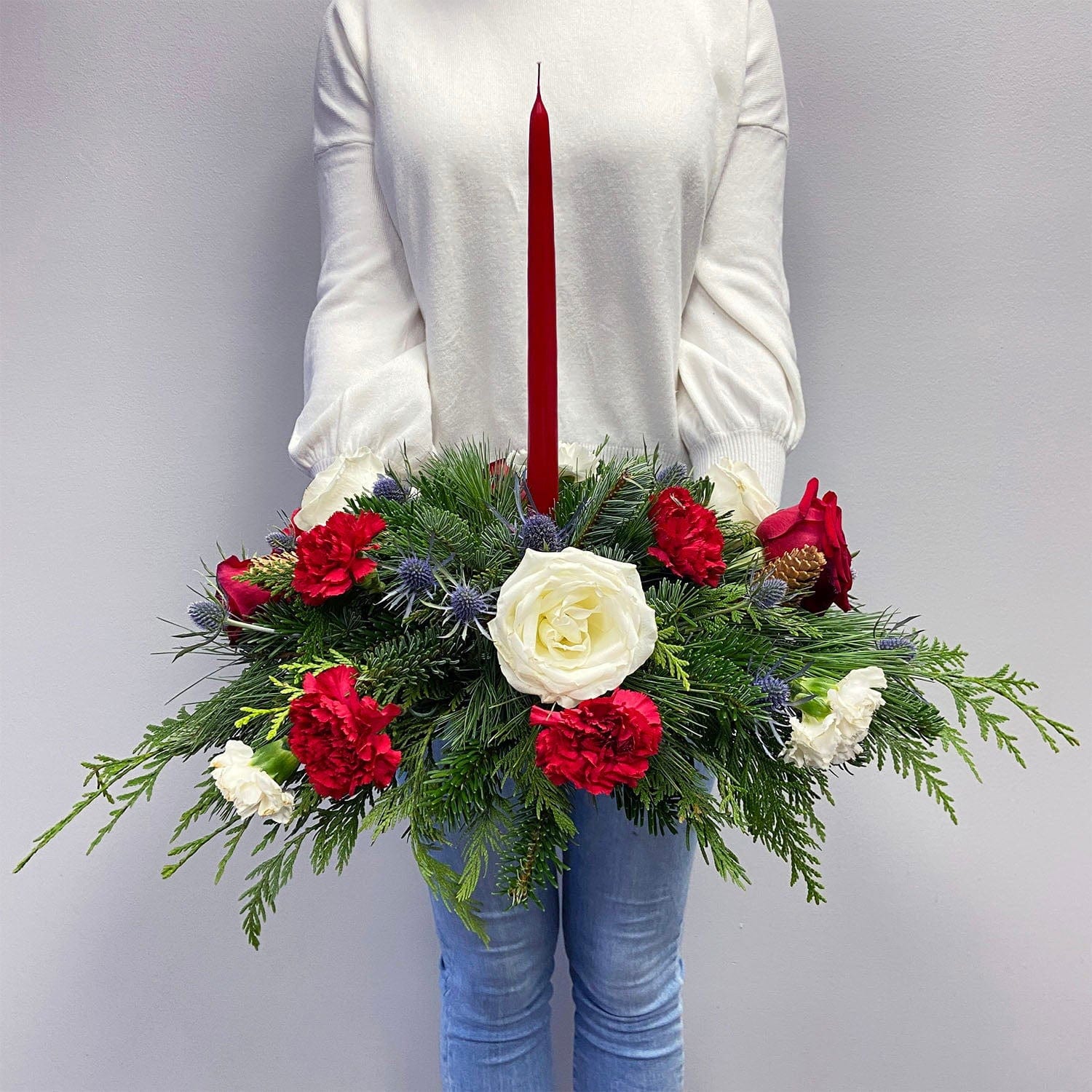 Designed to adorn a festive table or a home with seasonal charm. Created with a mix of roses, carnations, thistle, pine cones, and festive foliage, this centrepiece is the perfect complement to your holiday decor.
