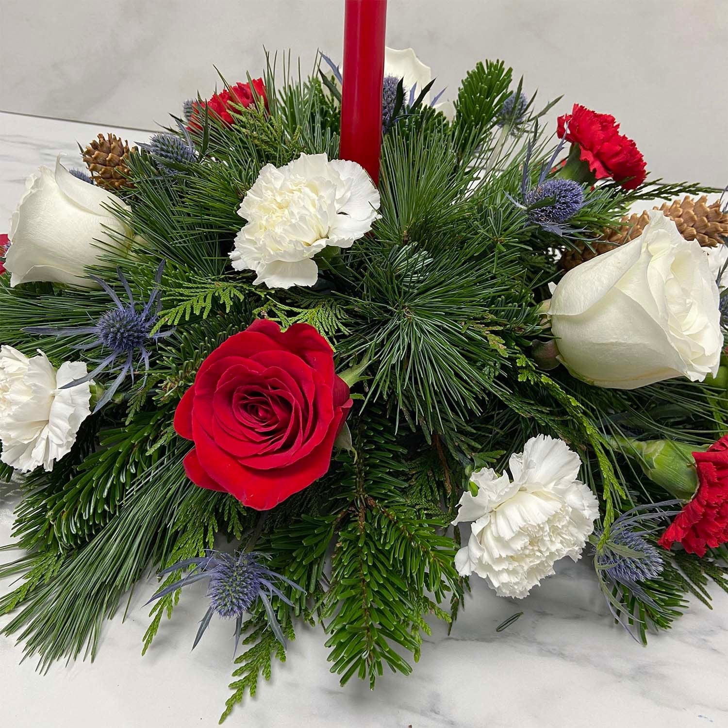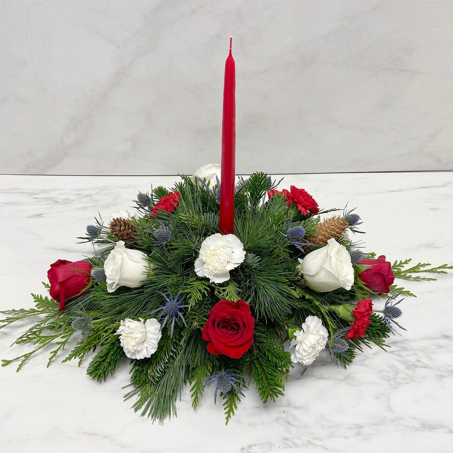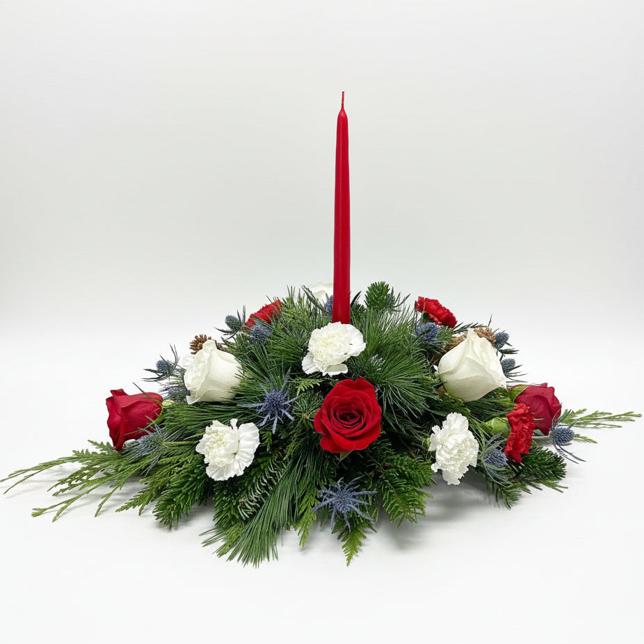 Designed to adorn a festive table or a home with seasonal charm. Created with a mix of roses, carnations, thistle, pine cones, and festive foliage, this centrepiece is the perfect complement to your holiday decor.