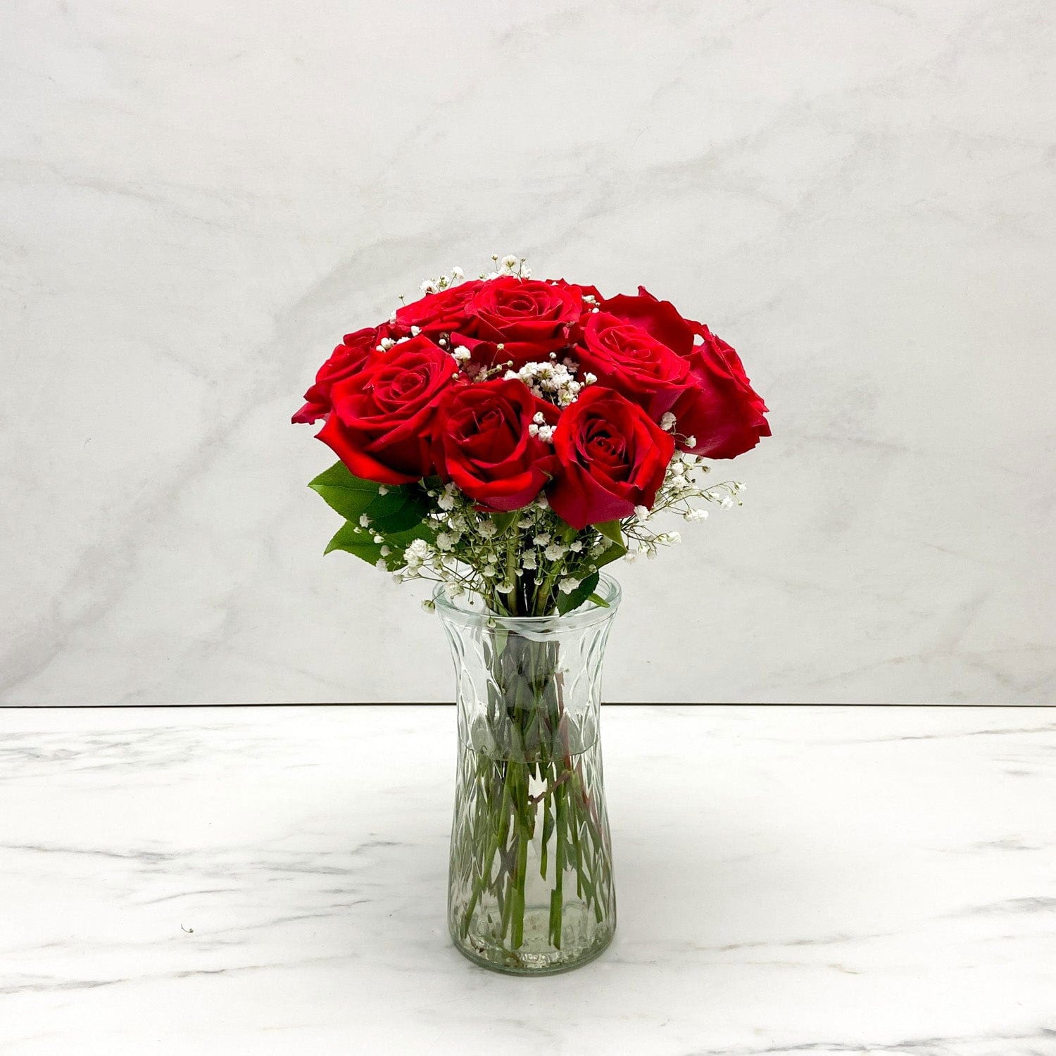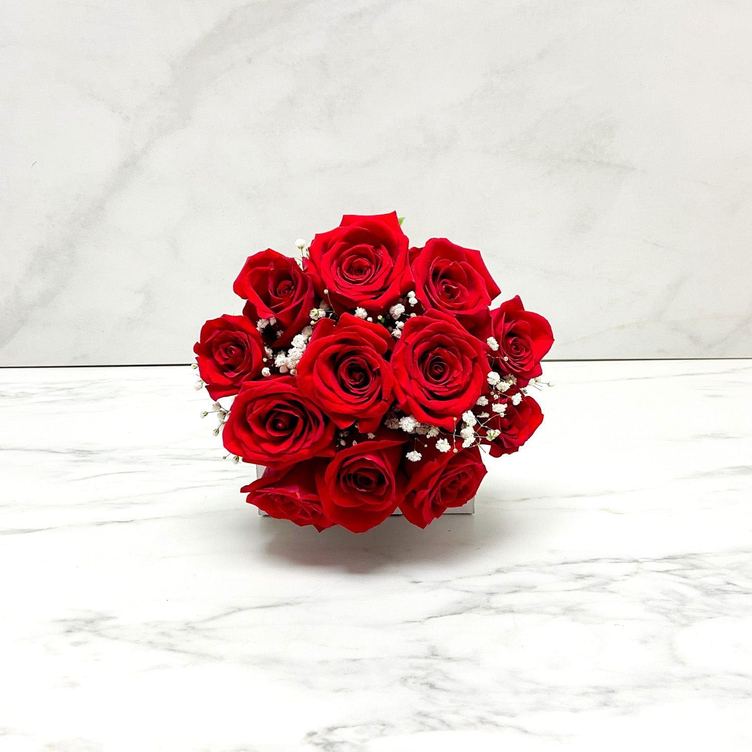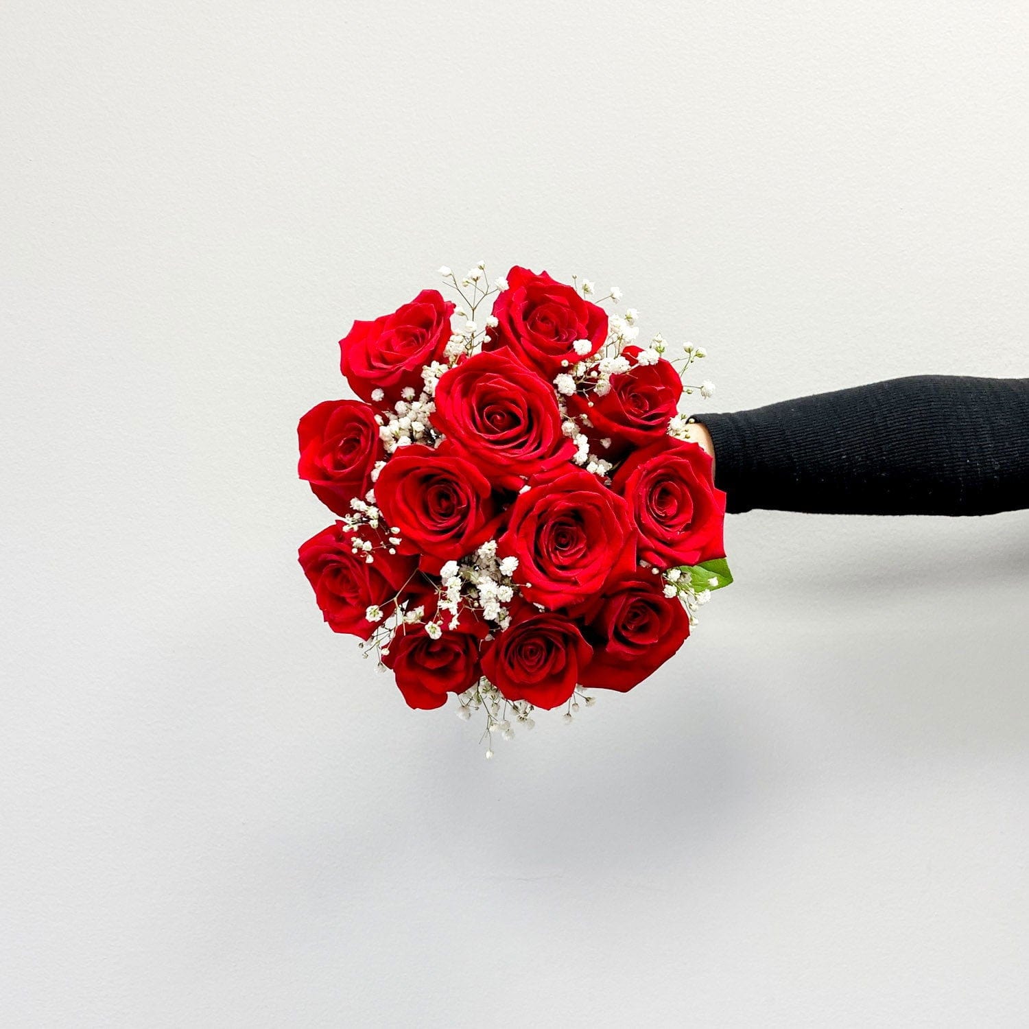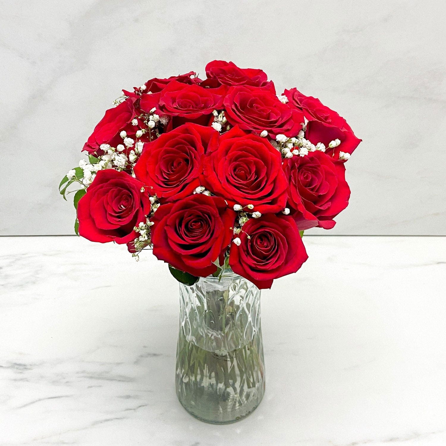 This beautiful arrangement features 12 deep red roses, symbolizing a timeless expression of romance and enduring love. Each velvety petal is perfectly complemented by gypsophila to add an exquisite touch of light.