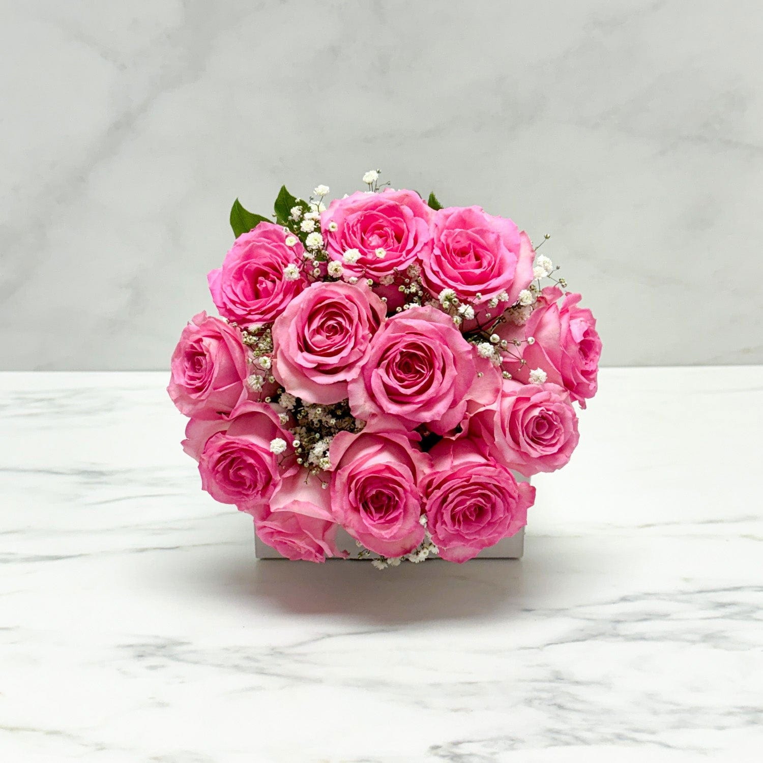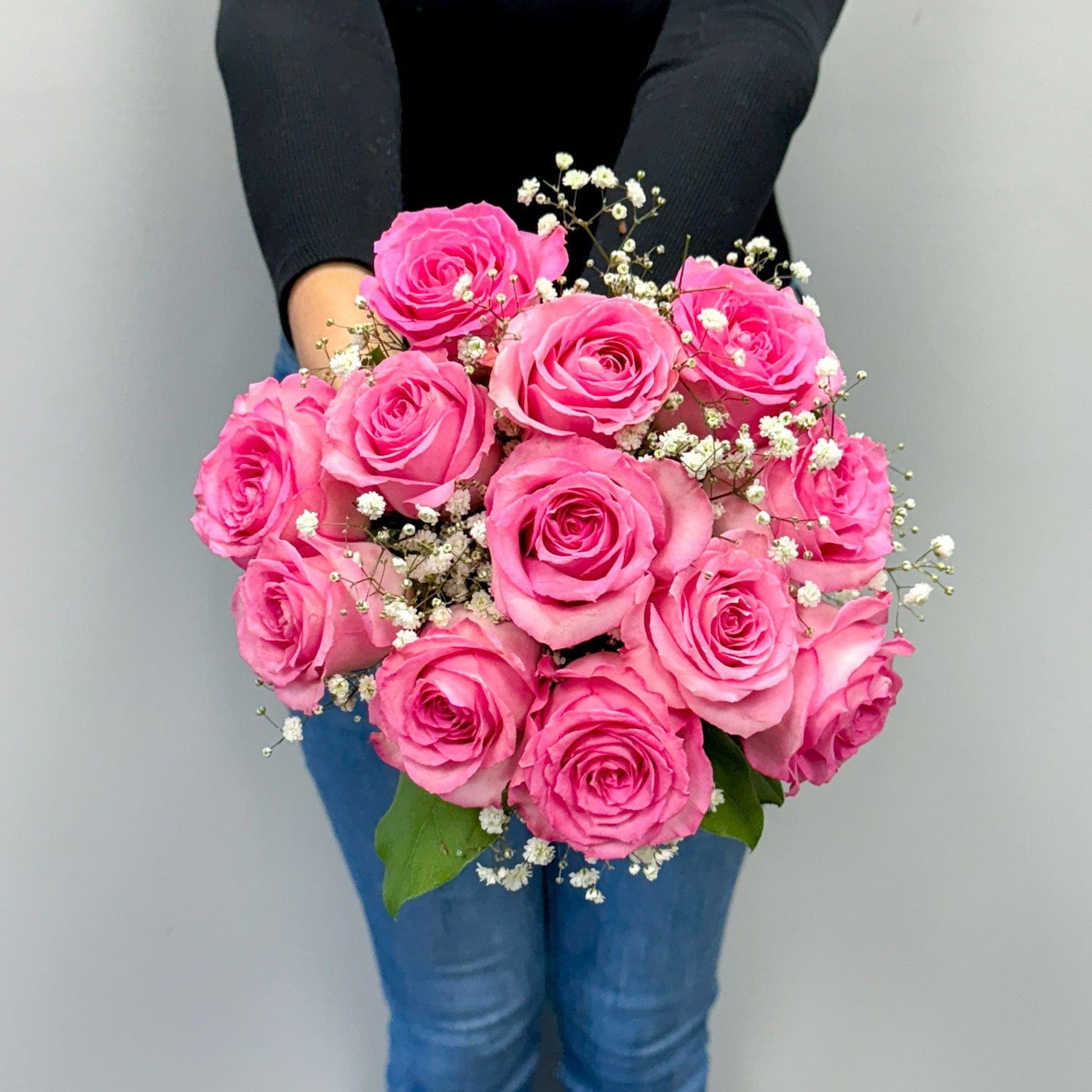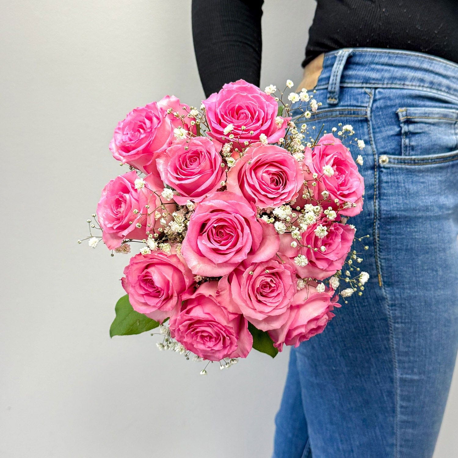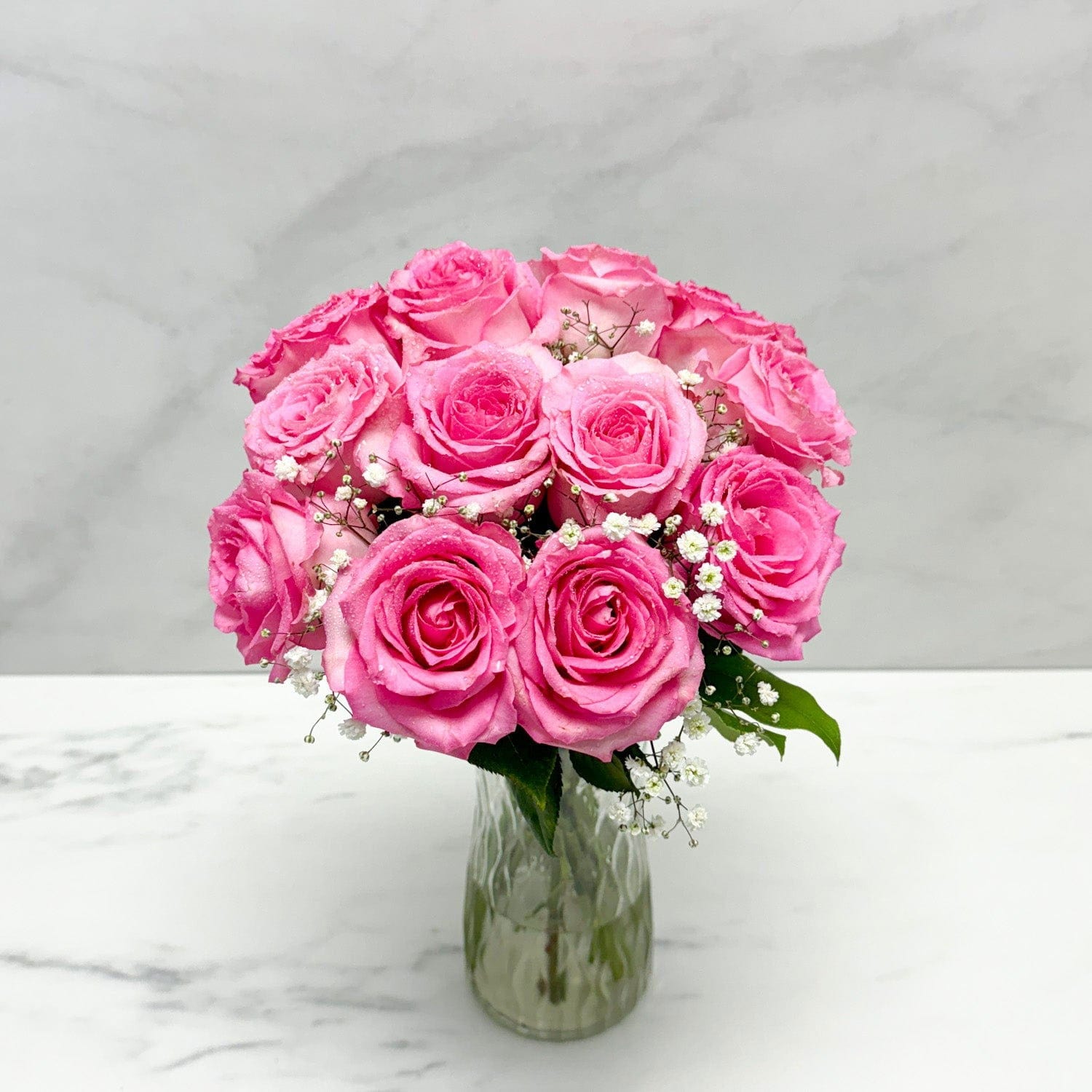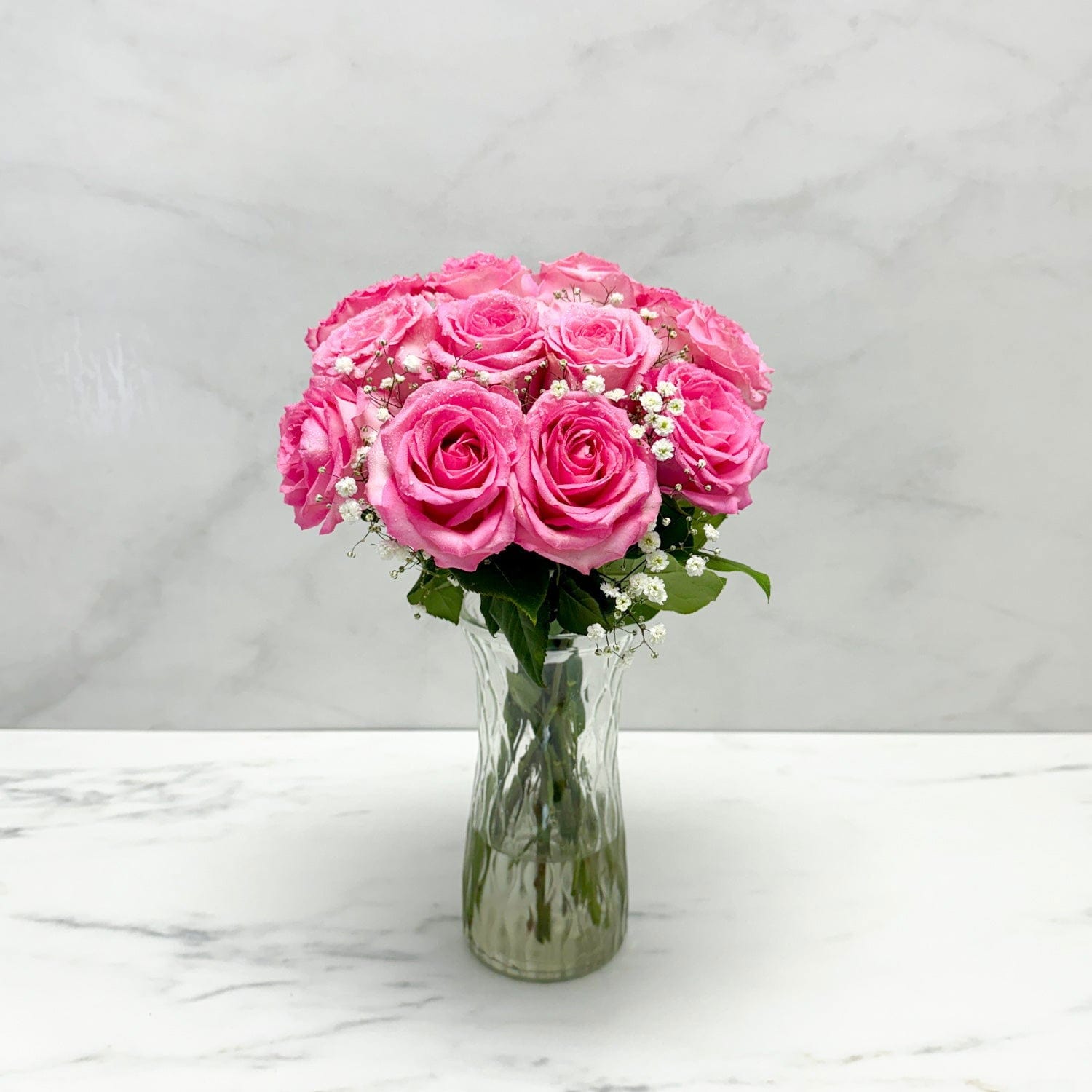 This beautiful arrangement features 12 roses, symbolizing a timeless expression of romance and enduring love. Each velvety petal is perfectly complemented by gypsophila to add an exquisite touch of light.