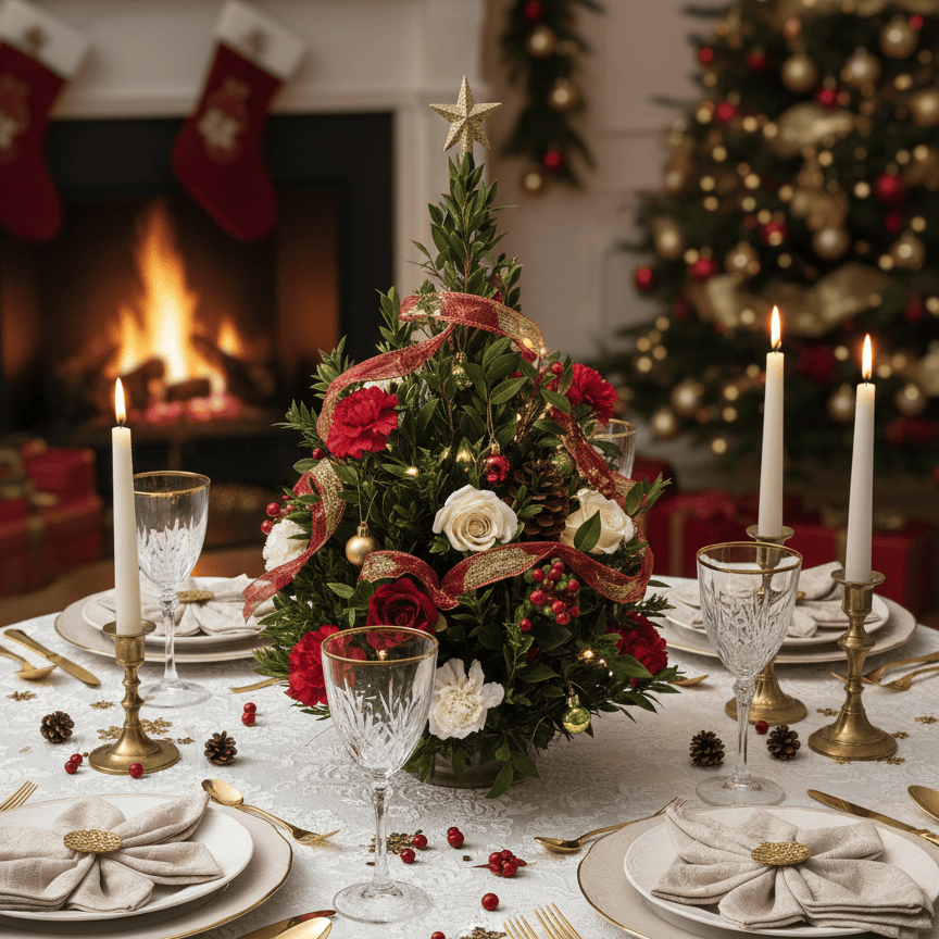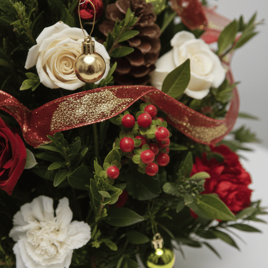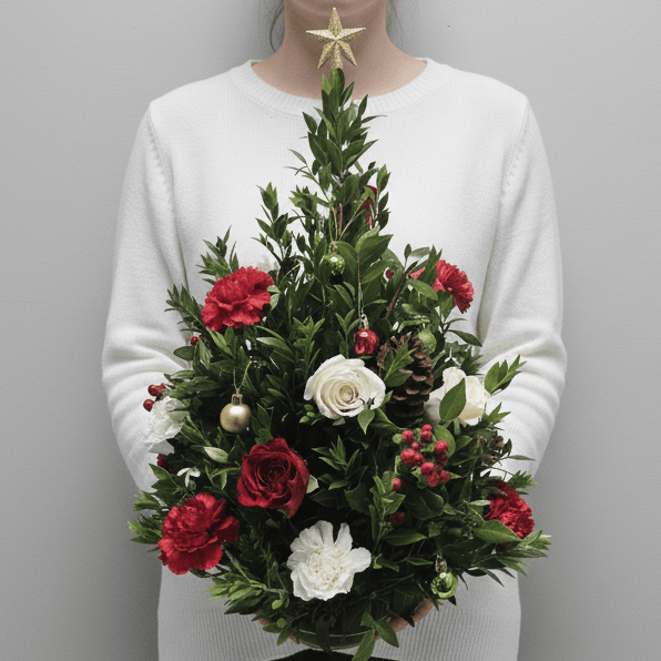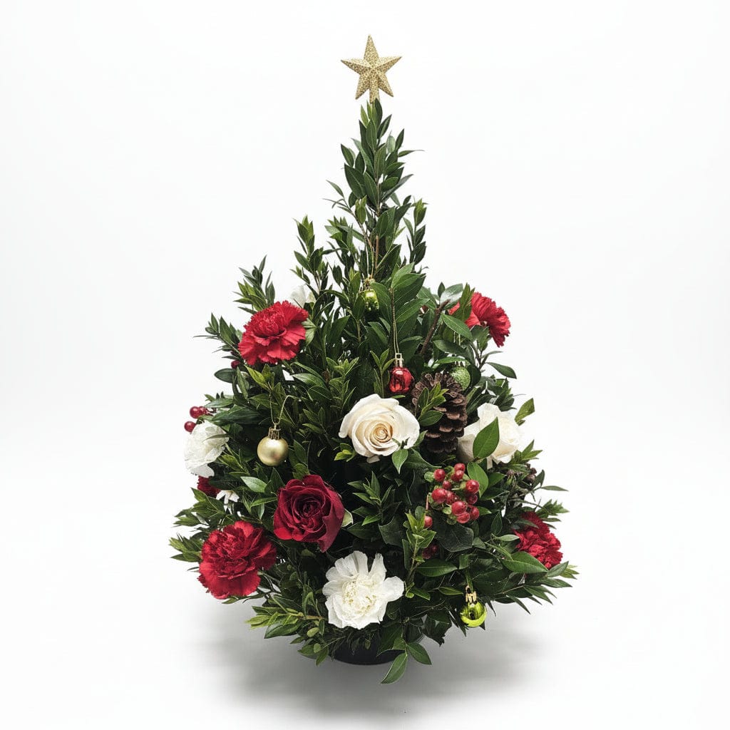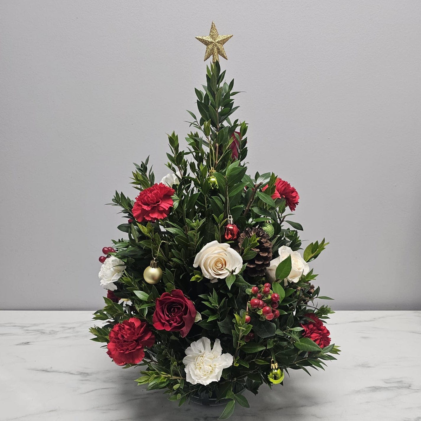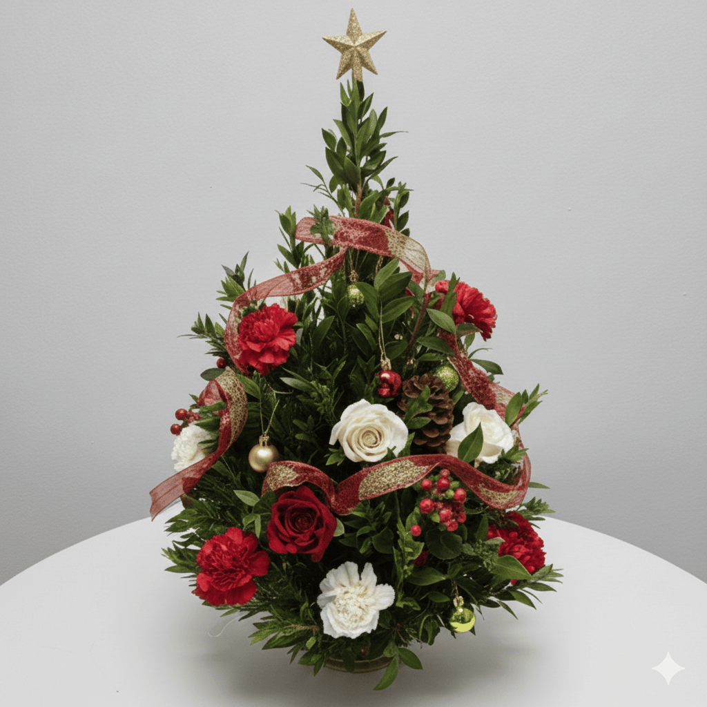 Elevate your holiday decor with our delightful Christmas Tree Arrangement, a miniature masterpiece that brings the spirit of the season to any table. Adorned with white and red carnations, white and red roses, berries, pine cones, and topped with a golden shiny star, this enchanting creation embodies the magic and joy of Christmas.