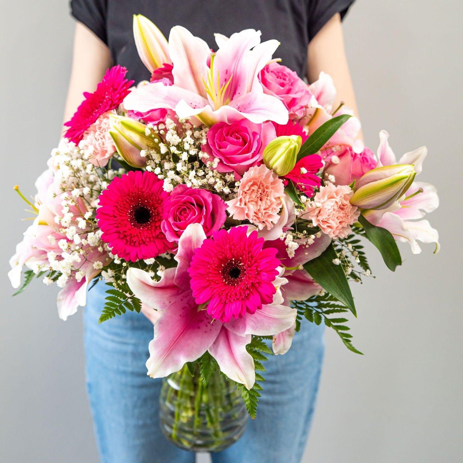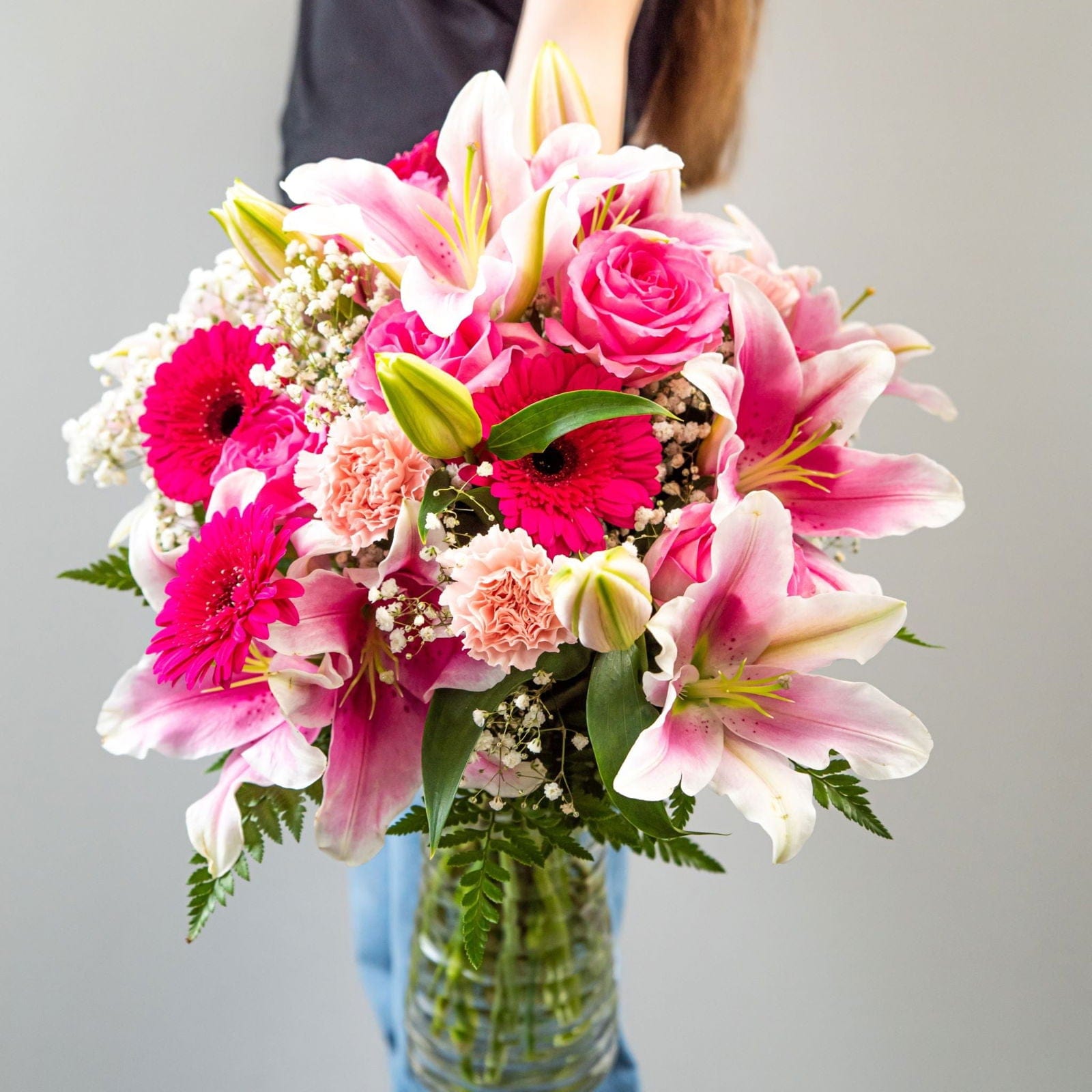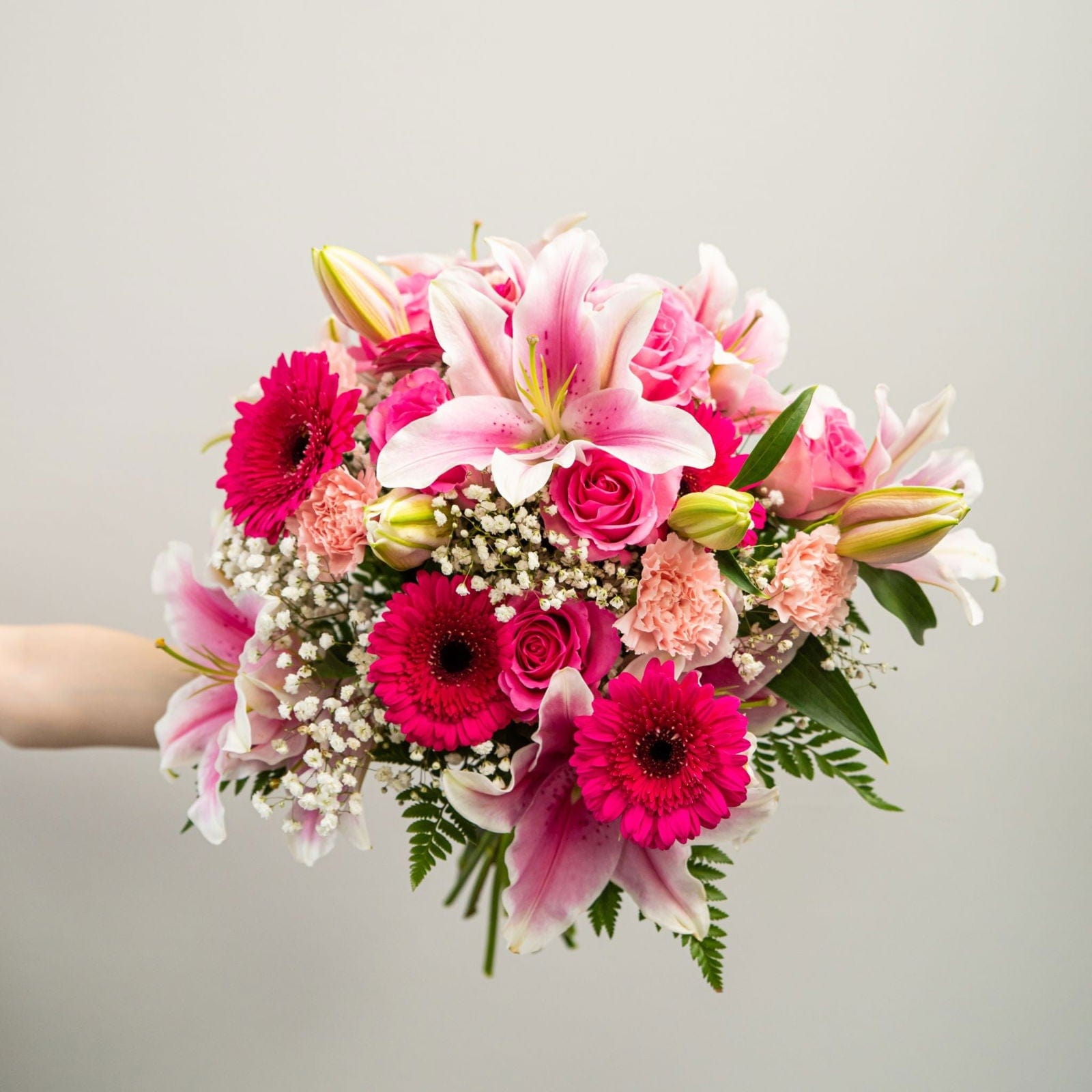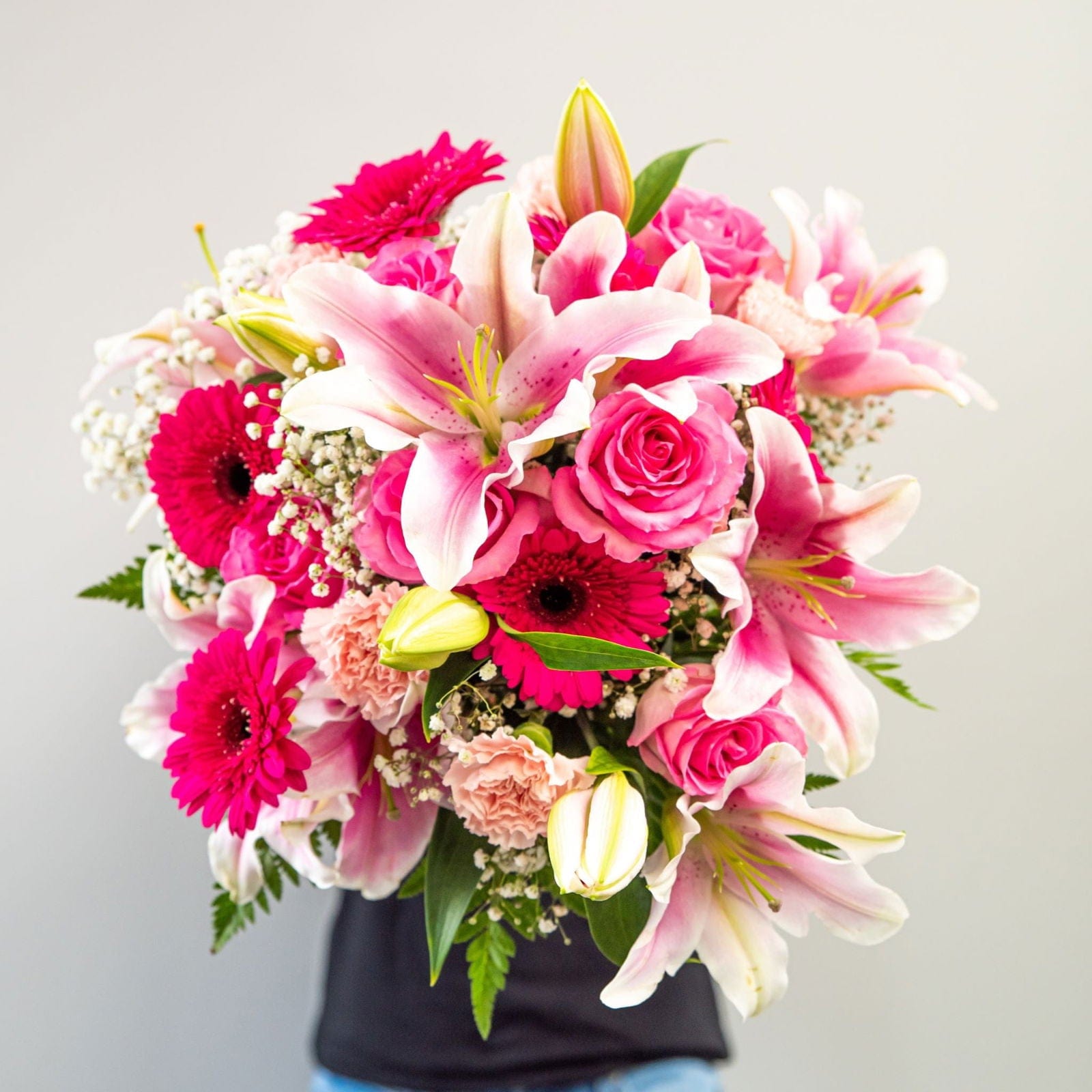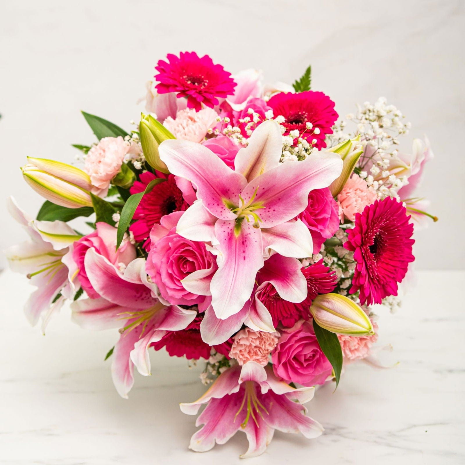 Our Happiness Bouquet is a delightful burst of joy that combines the elegance of pink lilies, the timeless beauty of roses, the playful charm of carnations, and the sunny disposition of gerberas. This vibrant arrangement is a celebration of life's cheerful moments.