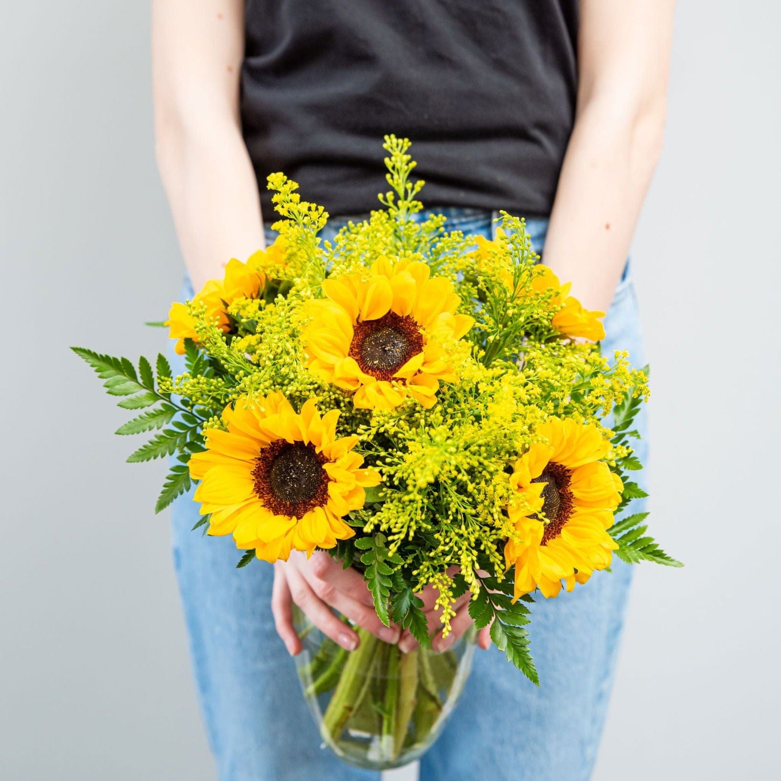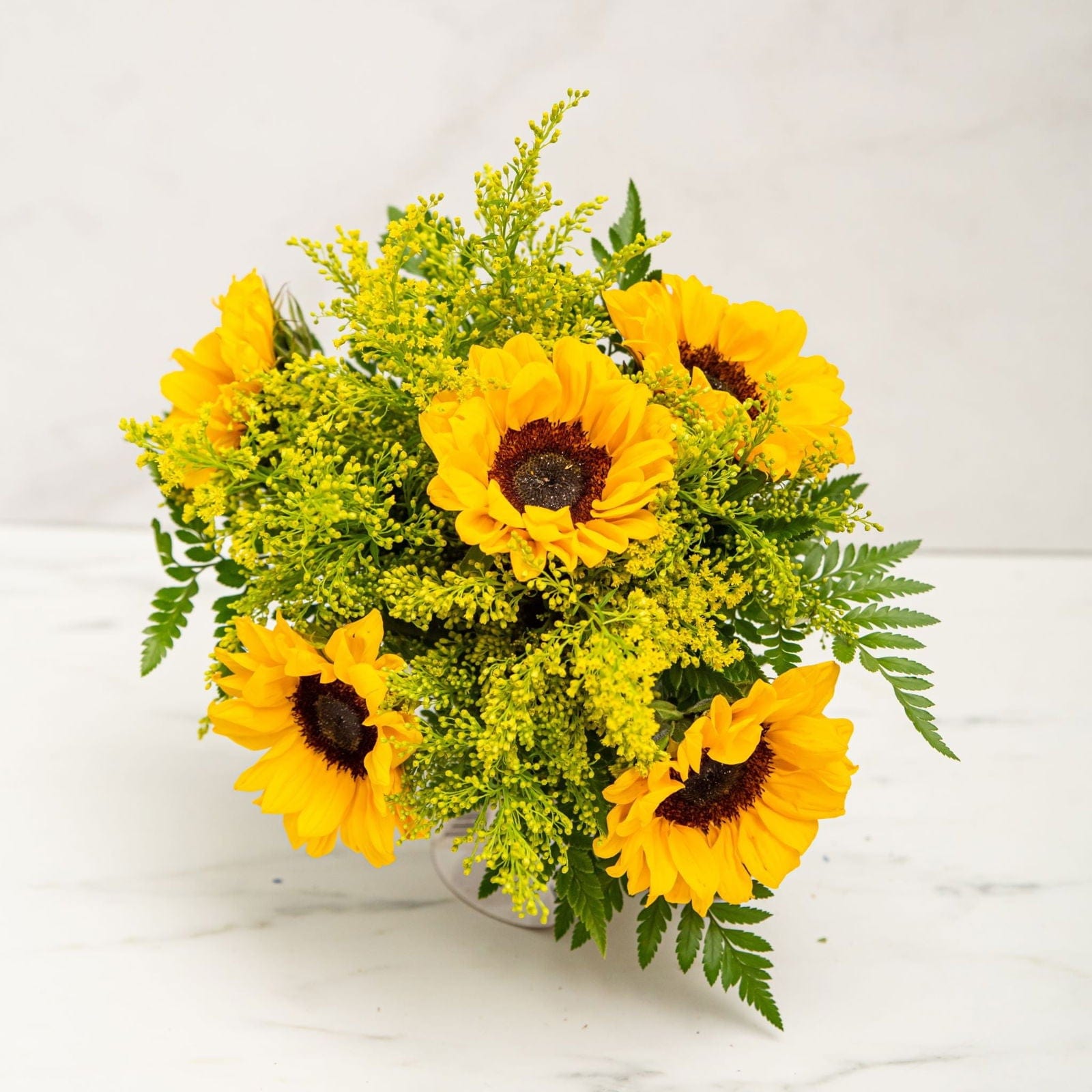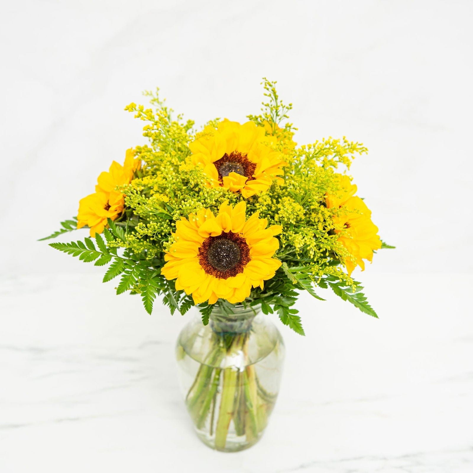 Our Sunflower Sweetness Bouquet is crafted with 5-6 cheerful sunflower stems complemented by solidago fill. Ready to create a special moment for your recipient, this bouquet exudes warmth, joy, and happiness, making it the perfect gift for any occasion.