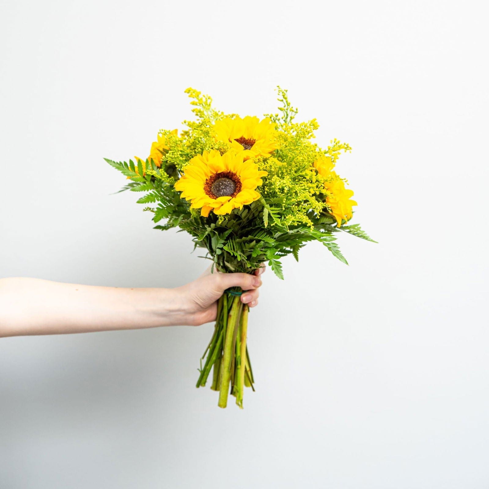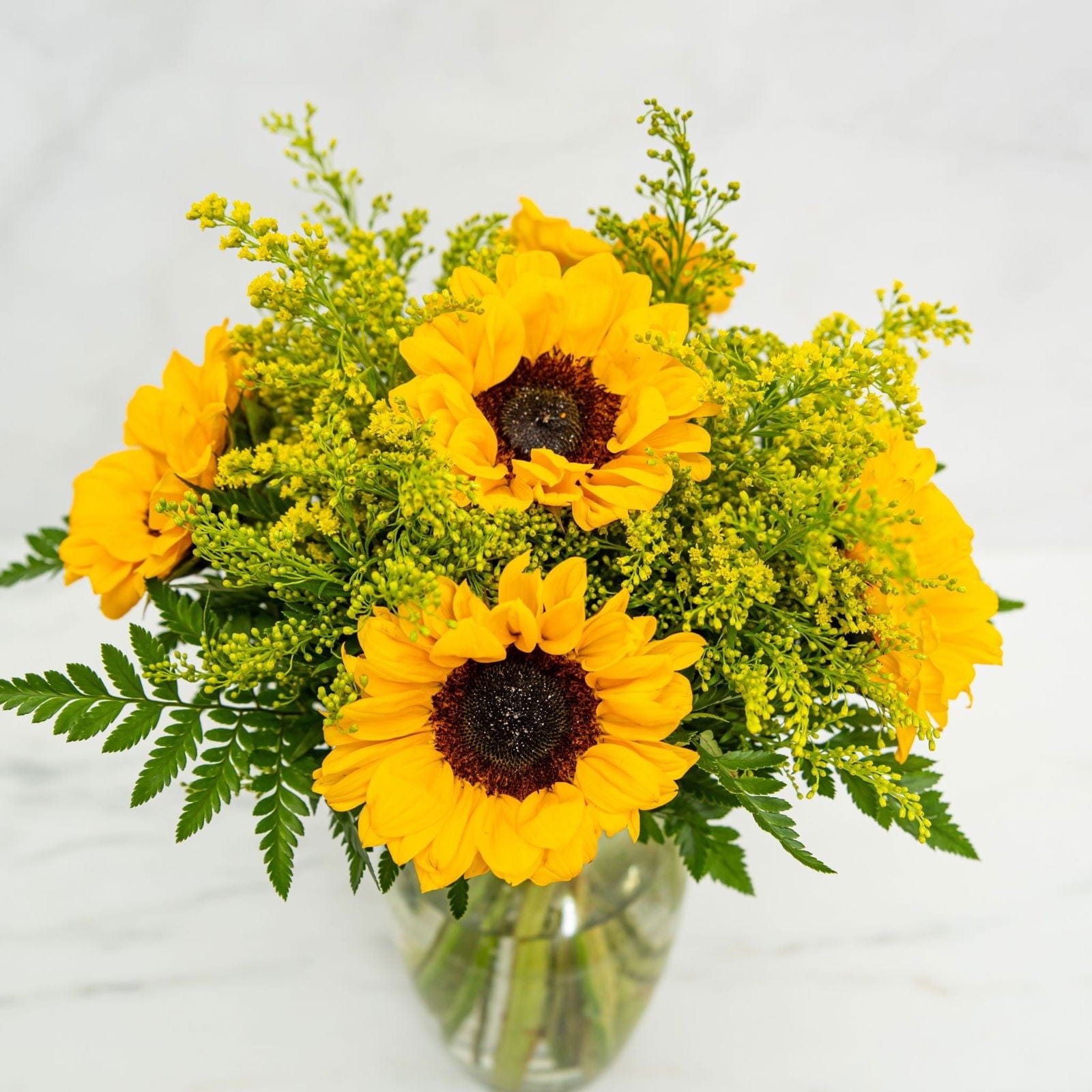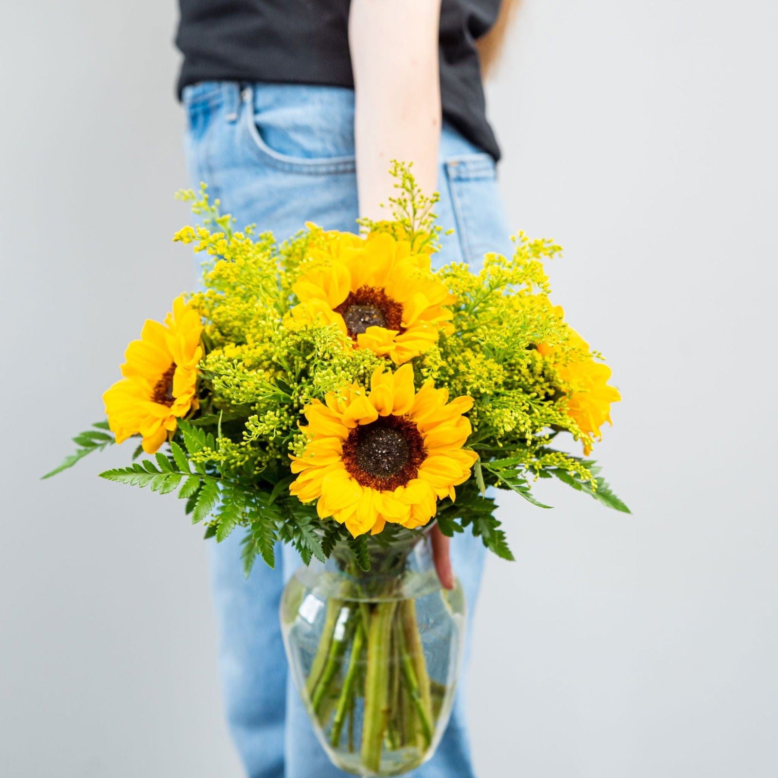 Our Sunflower Sweetness Bouquet is crafted with 5-6 cheerful sunflower stems complemented by solidago fill. Ready to create a special moment for your recipient, this bouquet exudes warmth, joy, and happiness, making it the perfect gift for any occasion.
