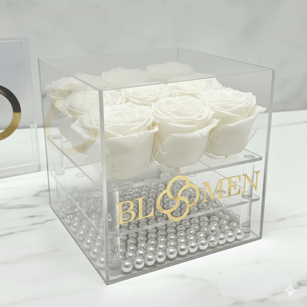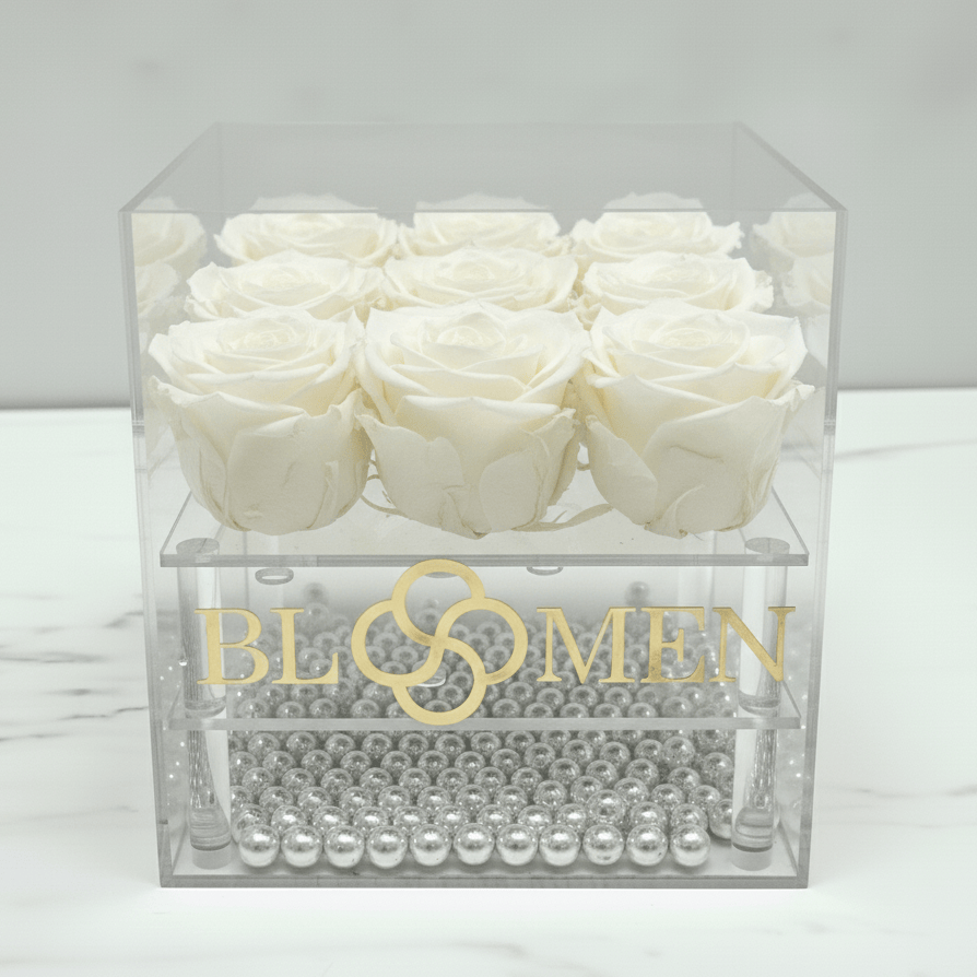 Express profound affection with our collection of 9 White Everlasting Roses, an elegant testament to enduring love. Hand-selected at their finest moment, each rose undergoes a sophisticated preservation process that safeguards its natural form, luminous color, and delicate beauty for an entire year. Nestled within a refined clear case, this contemporary presentation transforms a timeless gesture into a lasting keepsake. A distinguished choice for those who appreciate romance that transcends the ordinary.