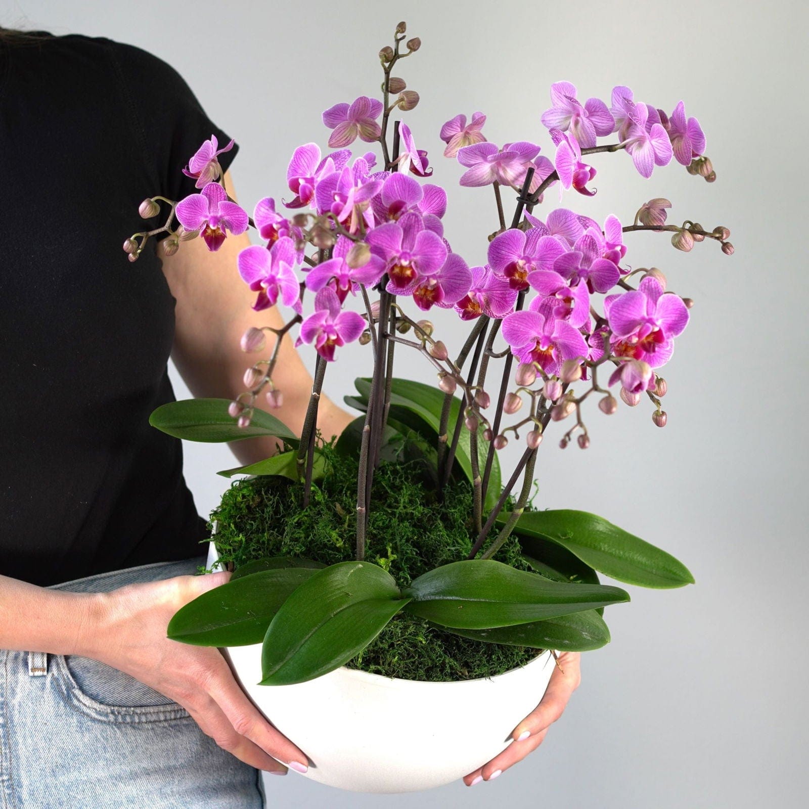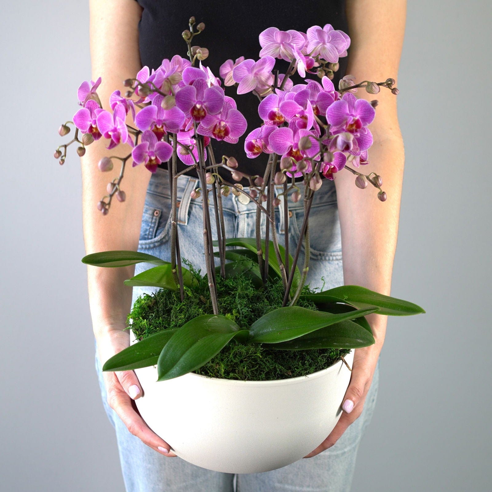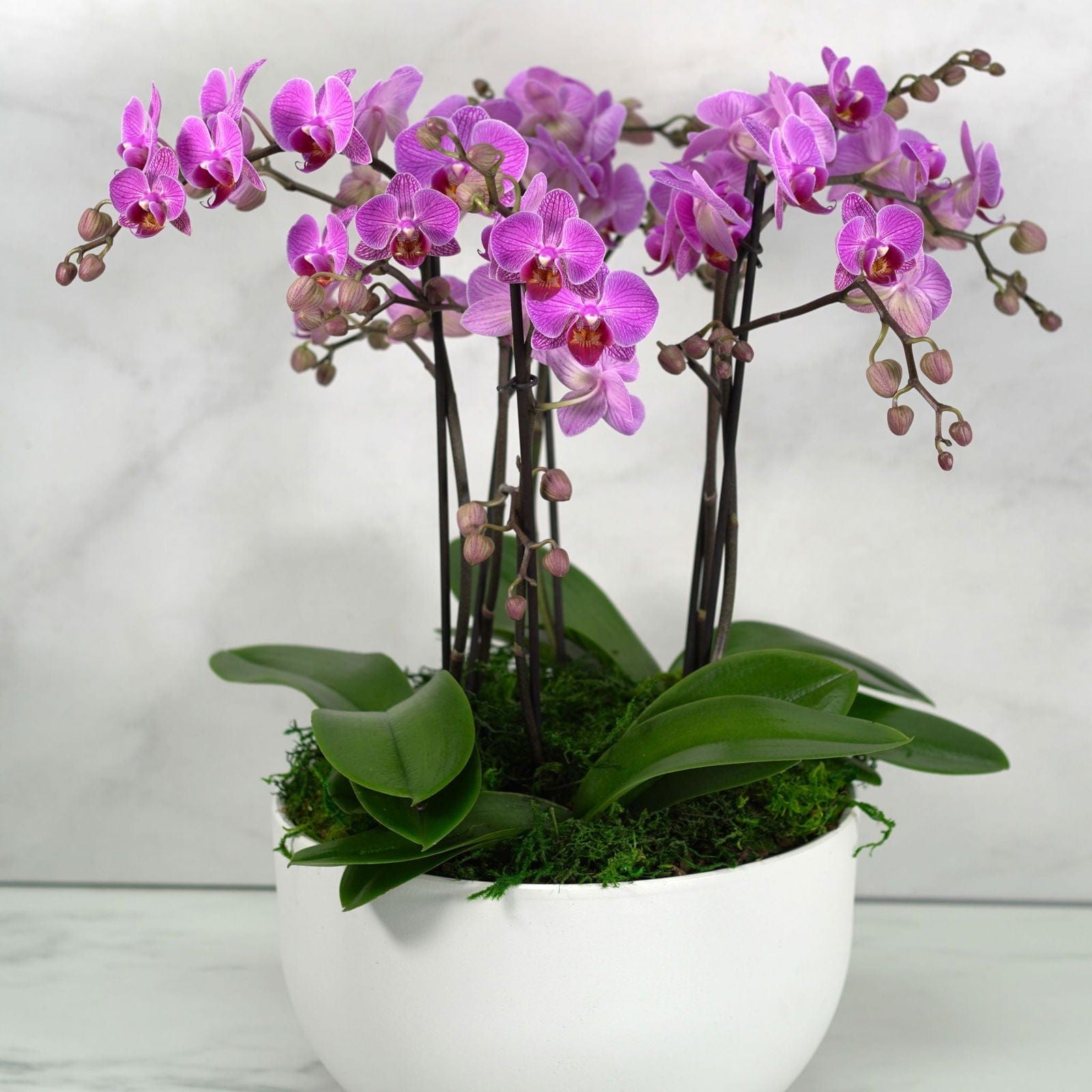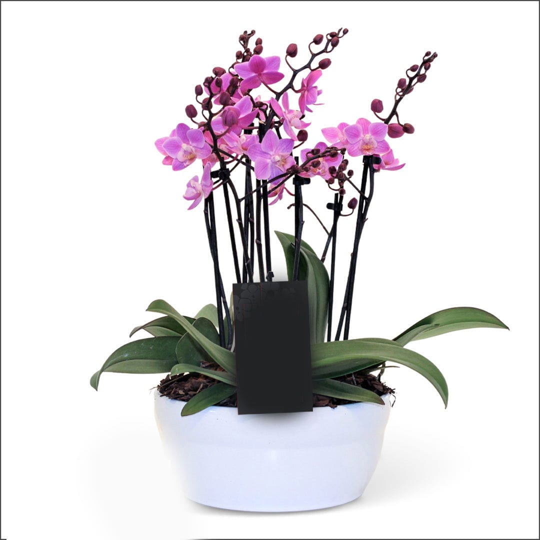 A striking ensemble that brings the beauty of orchids into your surroundings. This arrangement showcases lush orchid blooms nestled in an elegant planter bowl, exuding a sense of luxury and style. Whether gracing your home or given as a thoughtful gift, these orchids make a statement of timeless elegance and admiration.