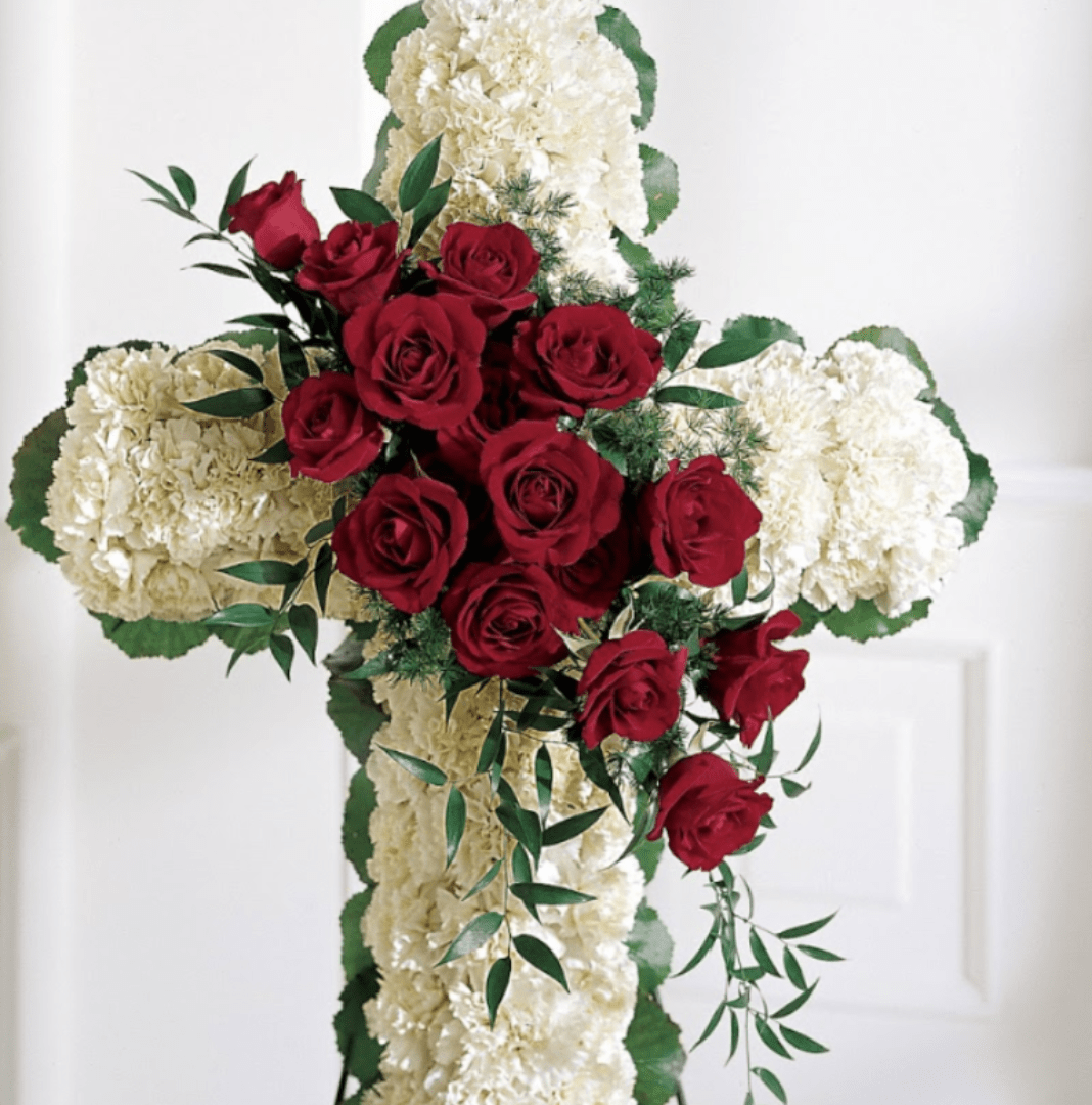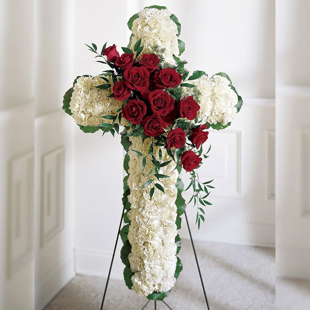 Reds, greens, and whites are used to construct this ravishing floral cross. Consisting of leaves, carnations, Italian ruscus, ming fern, and roses.
