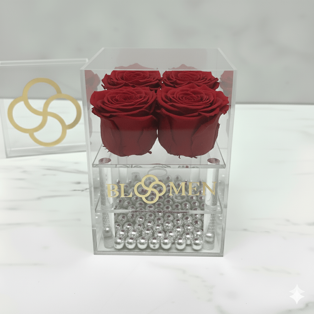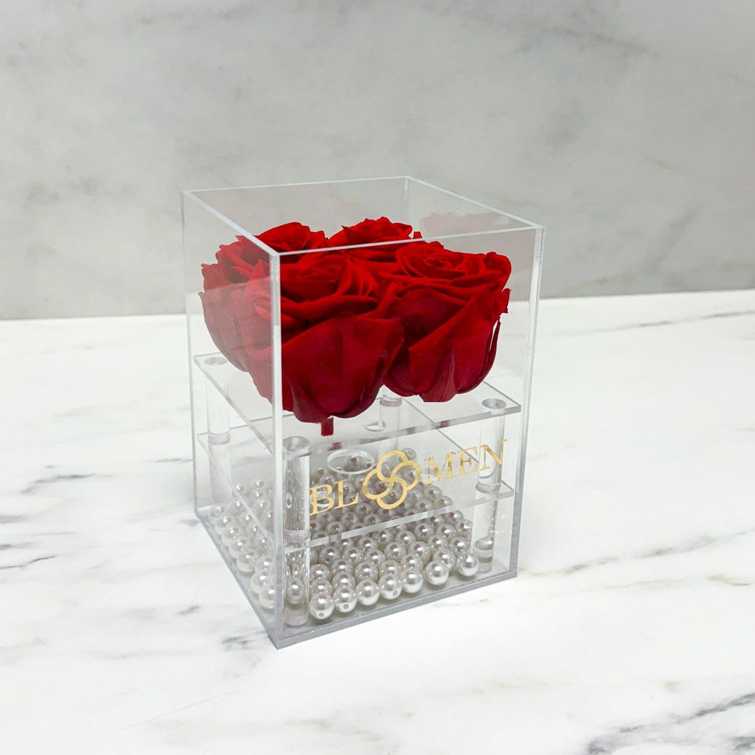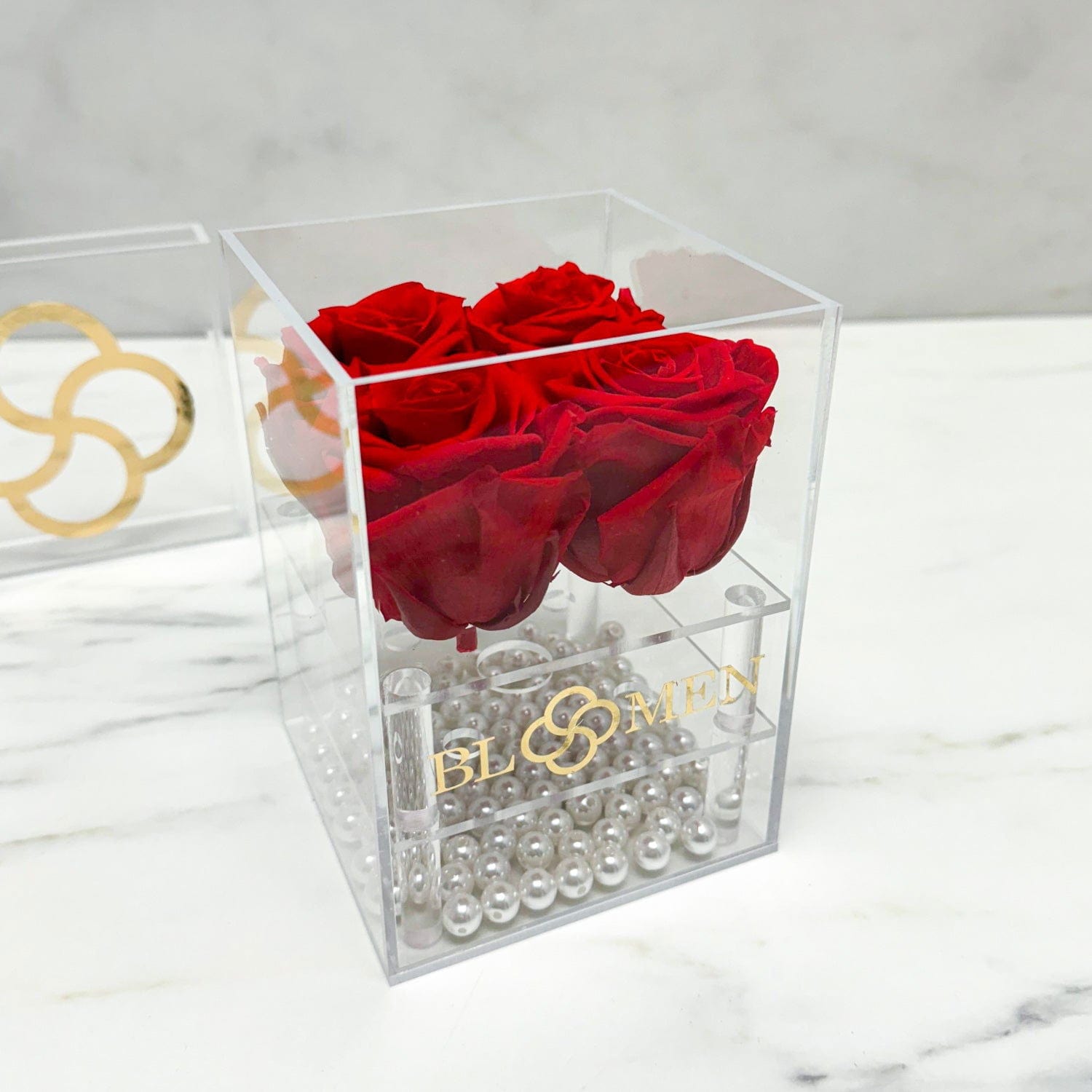 Real roses picked at their most beautiful then preserved to maintain their natural shape , colour and brightness, Bloomen's Everlasting Roses last up to one year.  Beautiful roses in a clear case made this modern arrangement a great way to showcase your love.