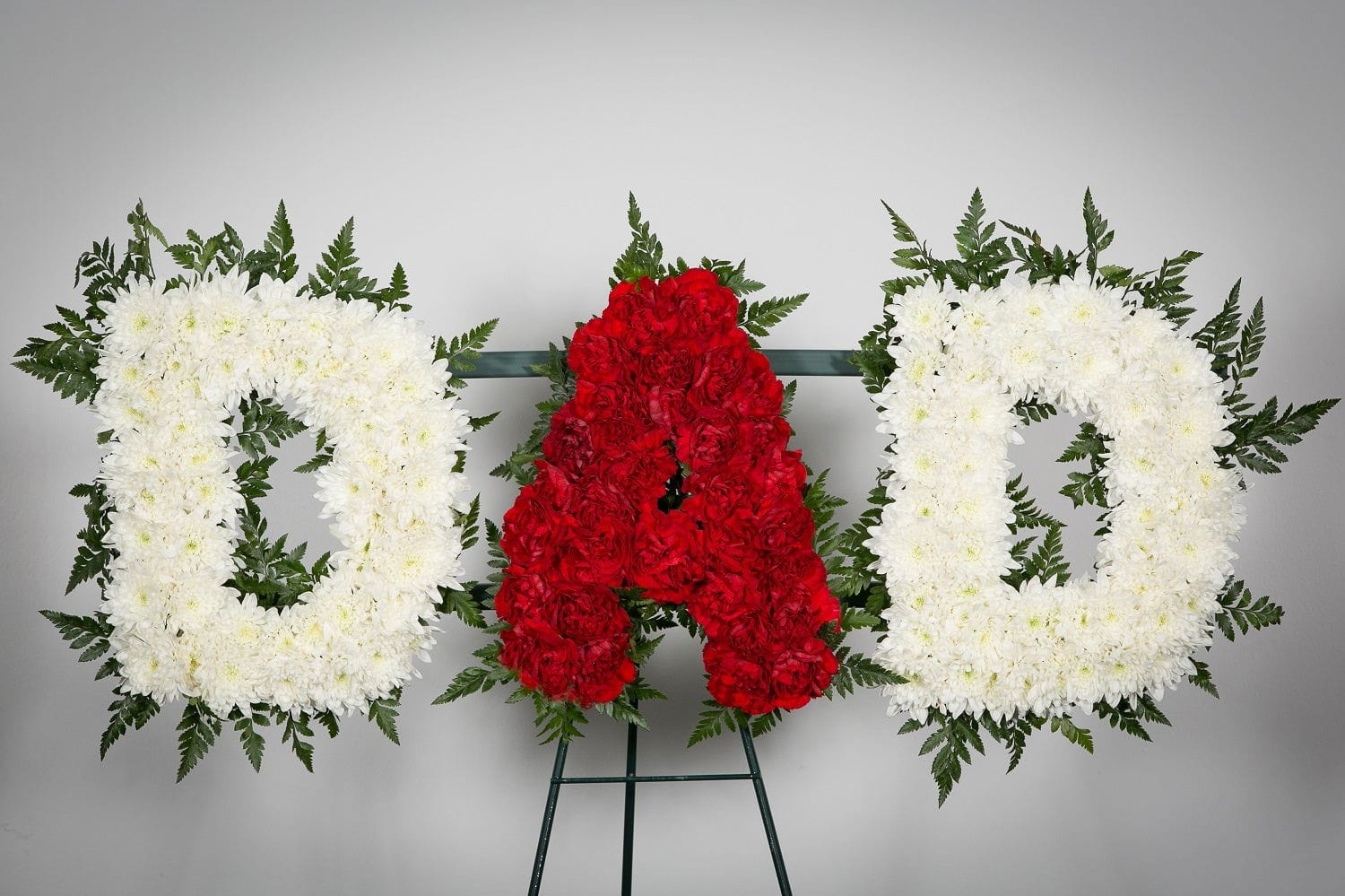 The Remembering Dad Arrangement is the perfect way to commemorate your father at his final farewell service. White chrysanthemums and red carnations are beautifully arranged to form the word, "Dad".